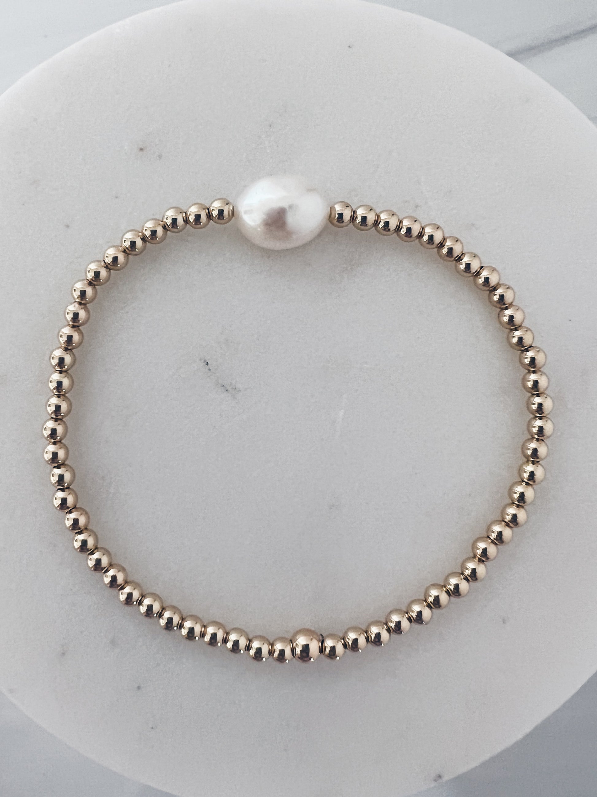 14k gold filled beads and a shimmering baroque pearl that are hand beaded to create a pretty bracelet.