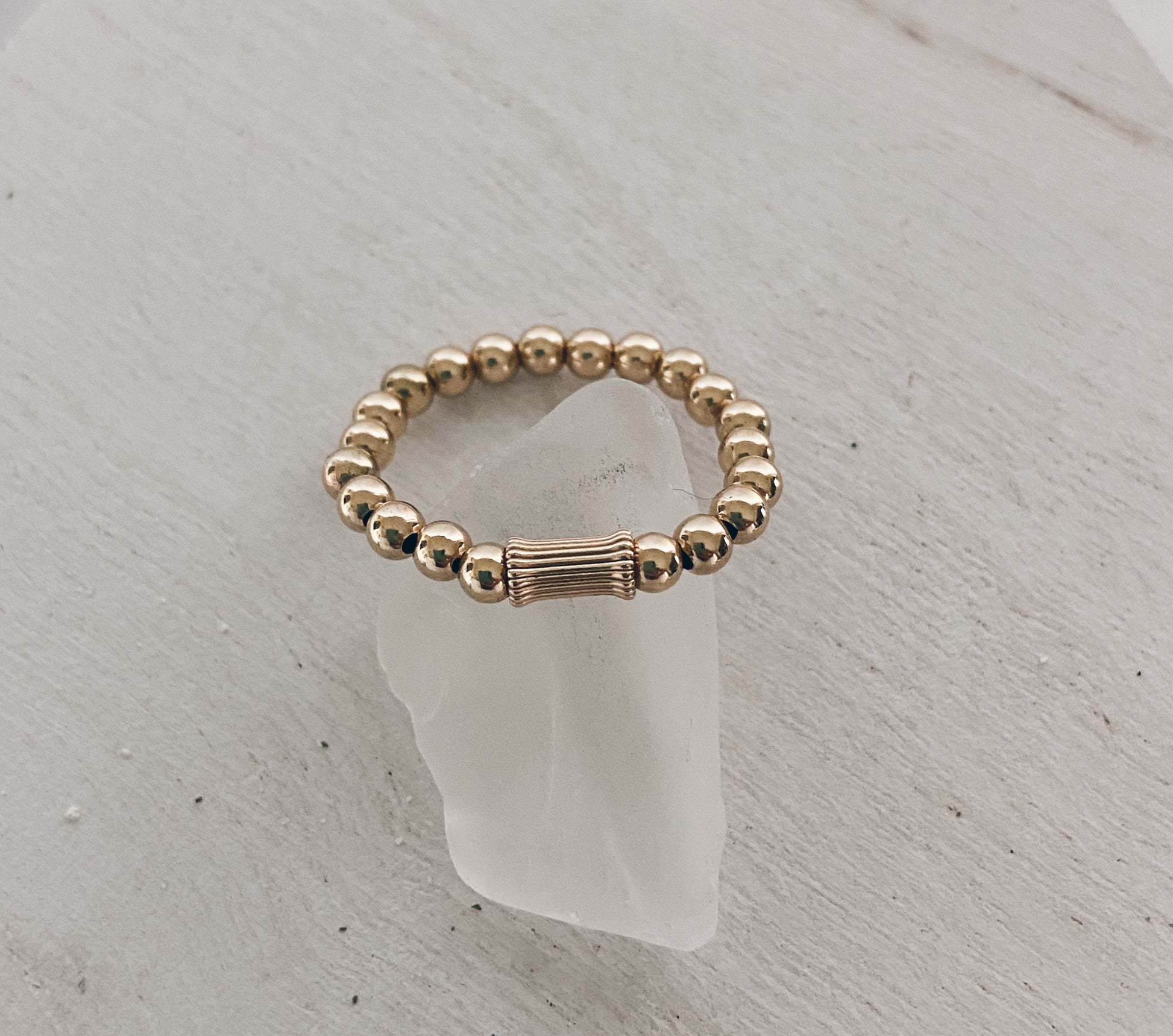 A pretty and dainty ring made with 14k gold filled beads and a grooved barrel bead.