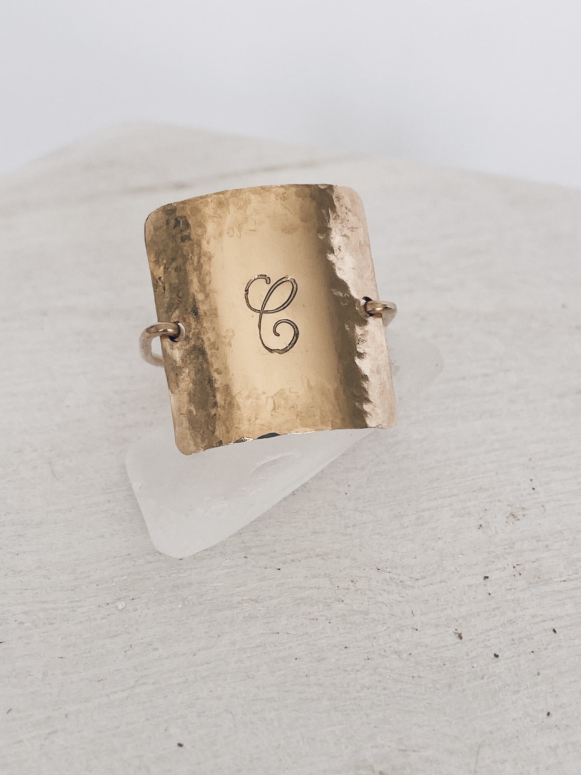 14k gold filled or sterling silver wire and a square disc that are hand hammered and stamped with your choice of initial. Pretty worn as a statement or stacked along with your favs!