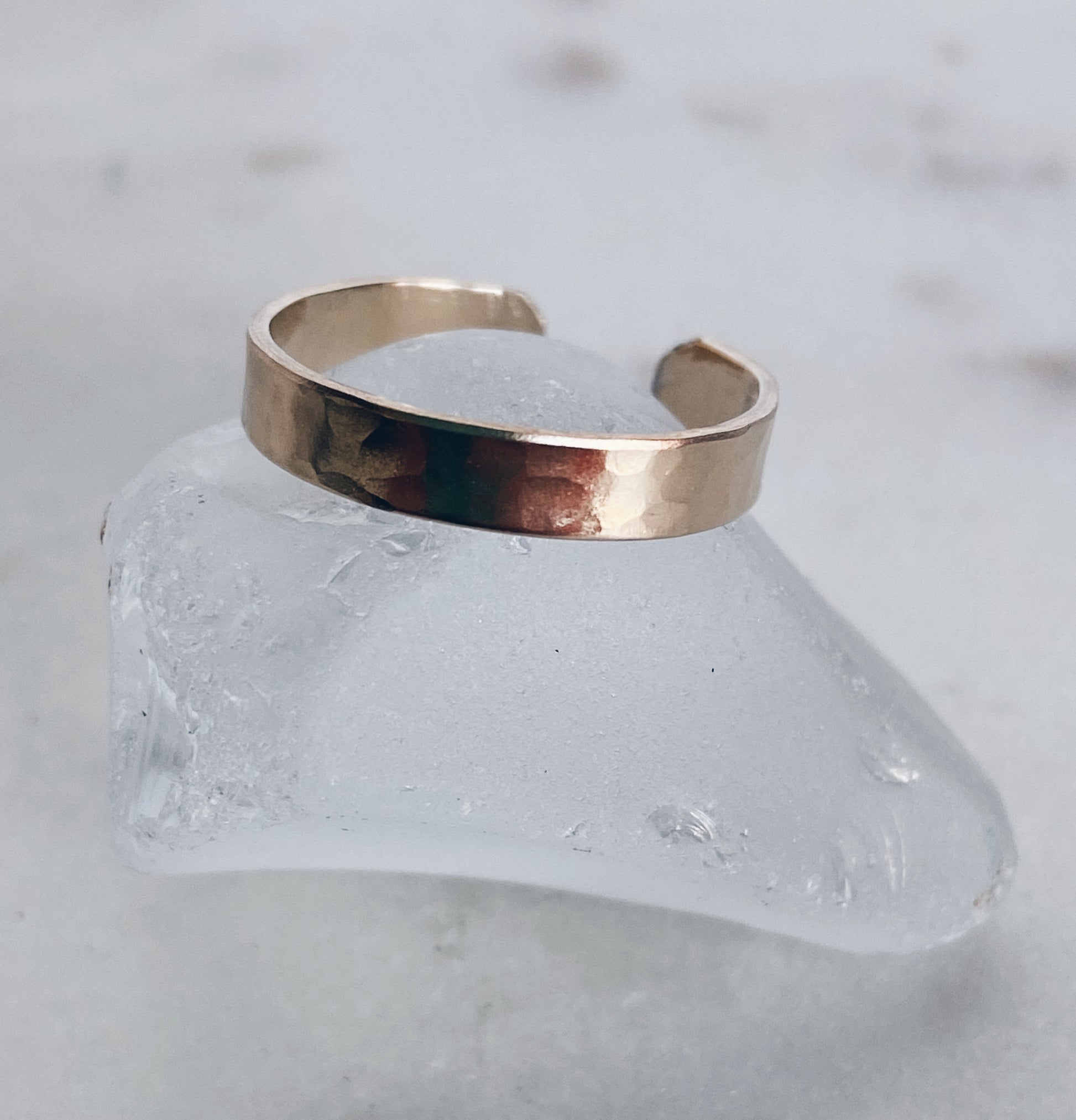 14k gold filled band that is hand hammered and forged into a cigar band. This is a heavy gauge metal and slightly adjustable. Recommend ordering your ring size.