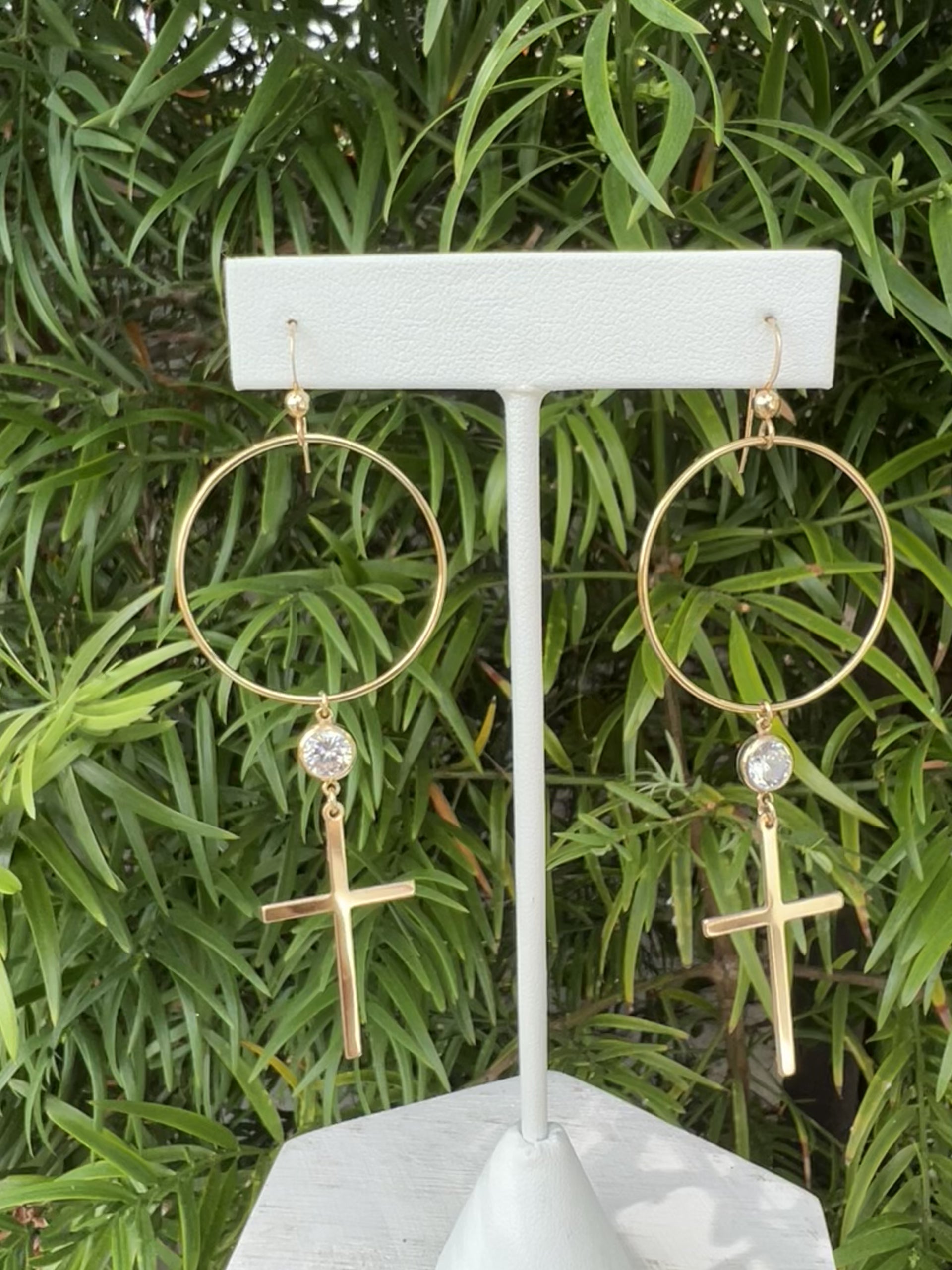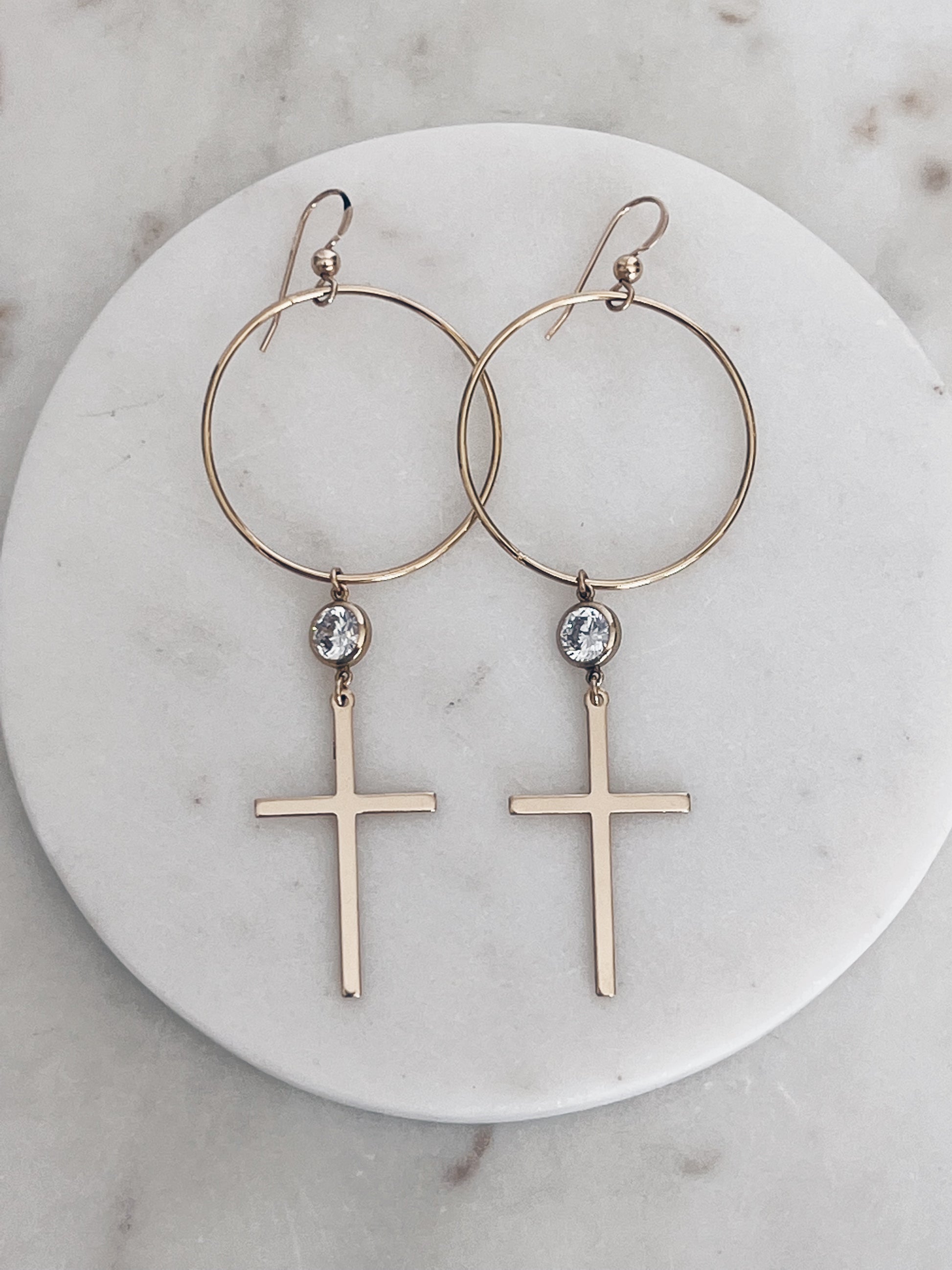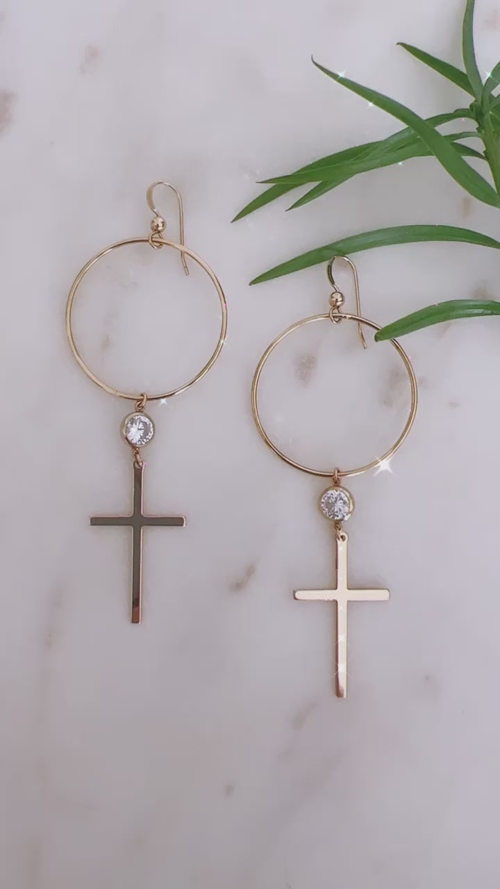 14k gold filled circle hoops are adorned with a sparkly cz and 14k gold filled cross. Perfect with your everyday tee or a night out!