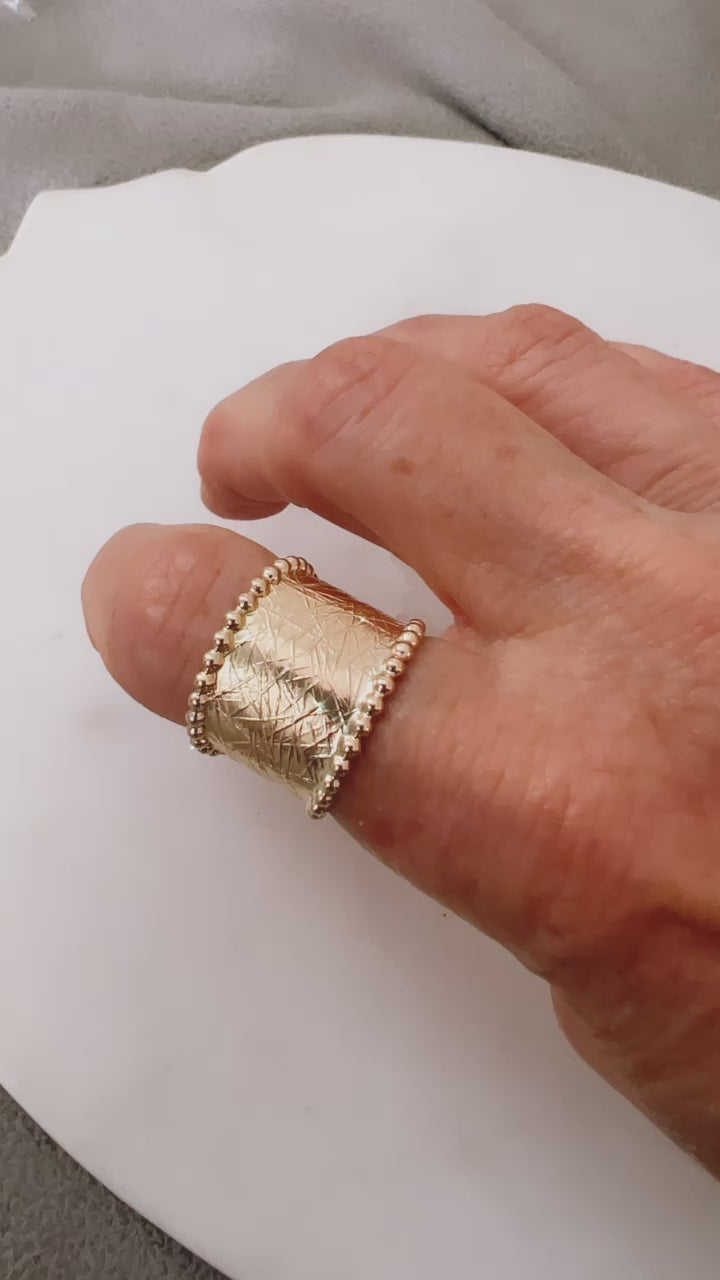 Make a statement with our gorgeous 14k Gold Filled Epic Ring! This stunning ring is embellished with beads and intricate textures. Looks amazing on your index or middle finger. Perfect for adding a touch of elegance and style to any outfit.