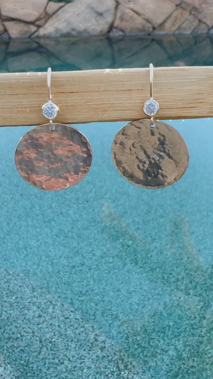 14k gold filled discs that are hammered to create a pretty shimmer and adorned with a cz earwire. Perfect with your fav tee and denim or lbd!