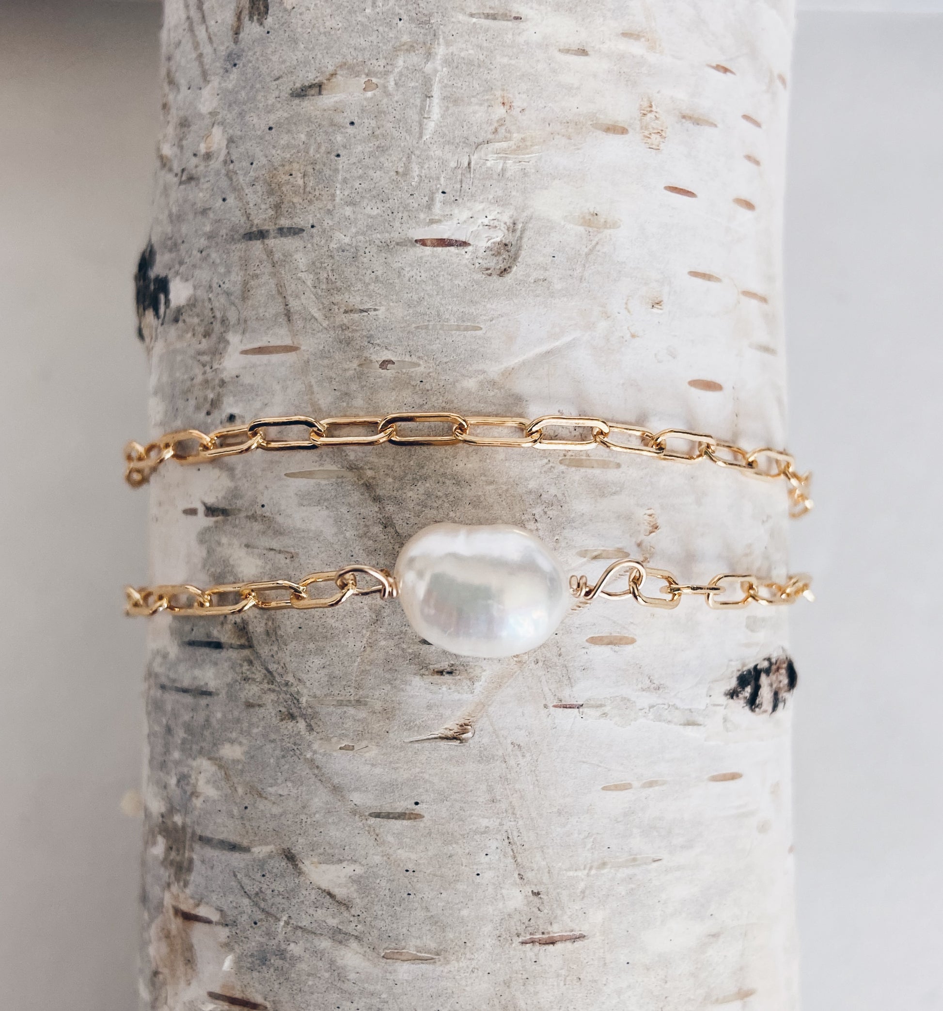14k gold filled short link chains adorned with a baroque pearl that is hand wired onto the chain. Beautiful on it's own or layered with your favs.
