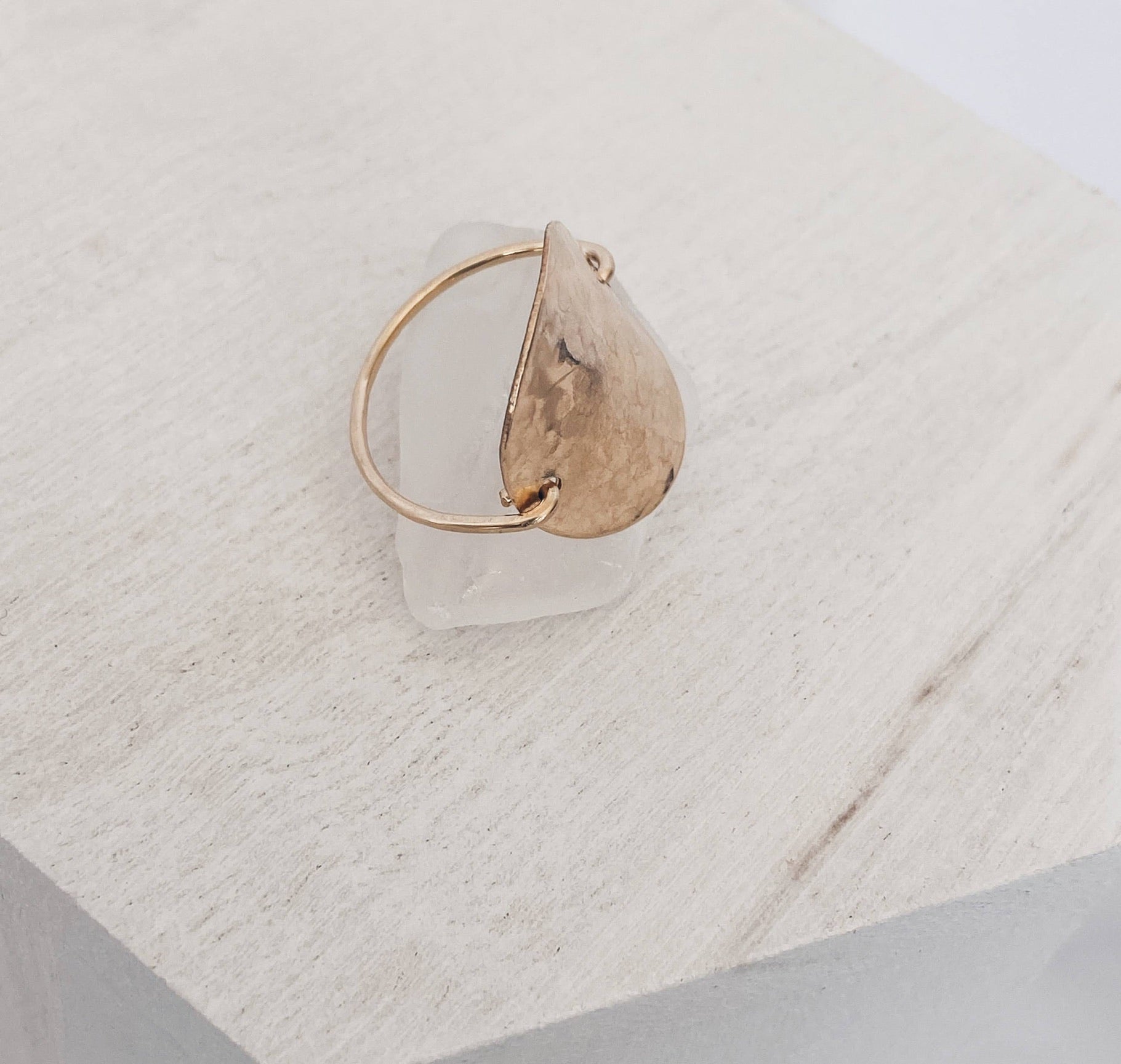 14k gold filled wire and orb that are hand hammered and made into a ring. Pretty worn as a statement or stacked along with your favs!