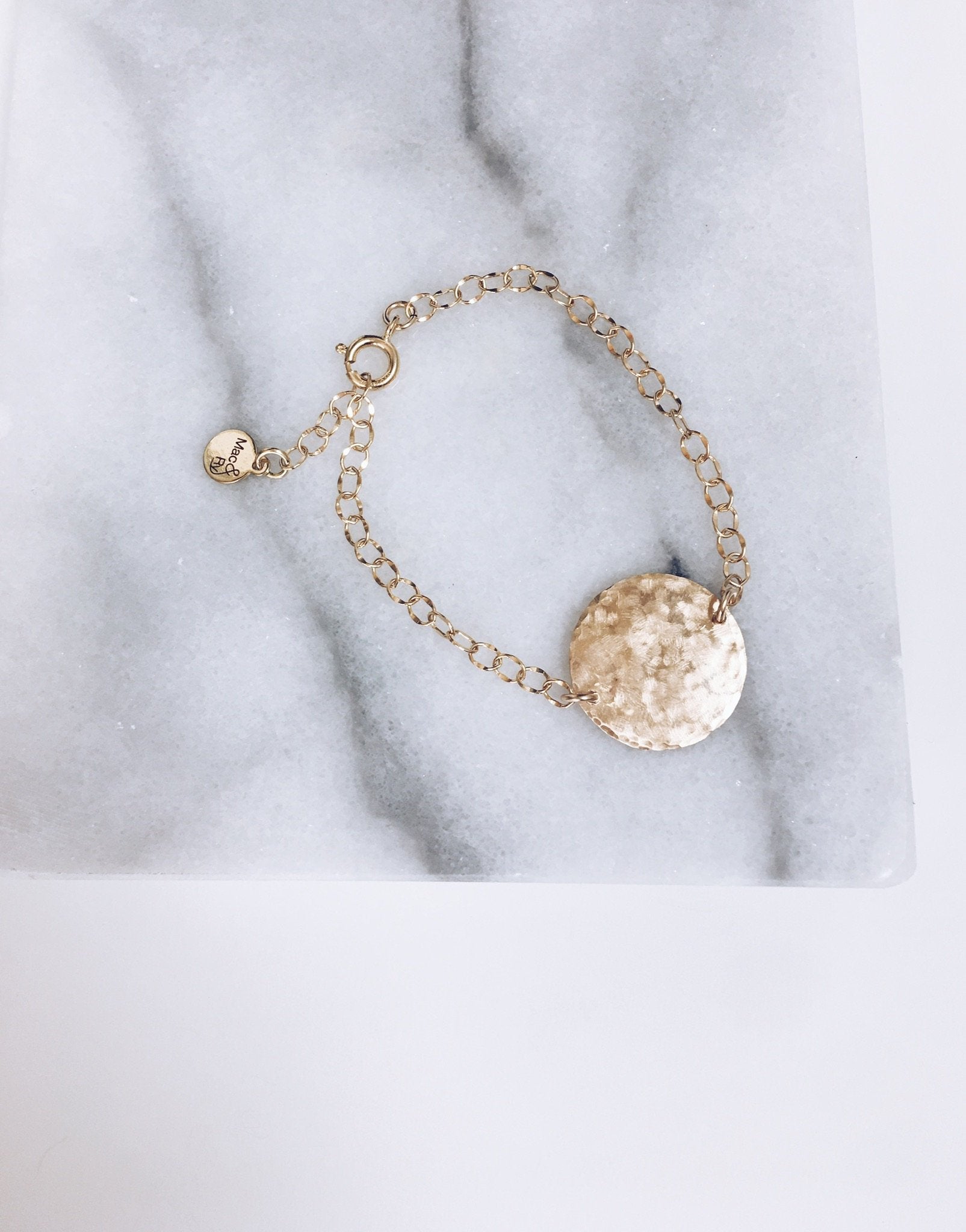 Gold filled or sterling hand hammered coin disc bracelet on a pretty dapped chain.