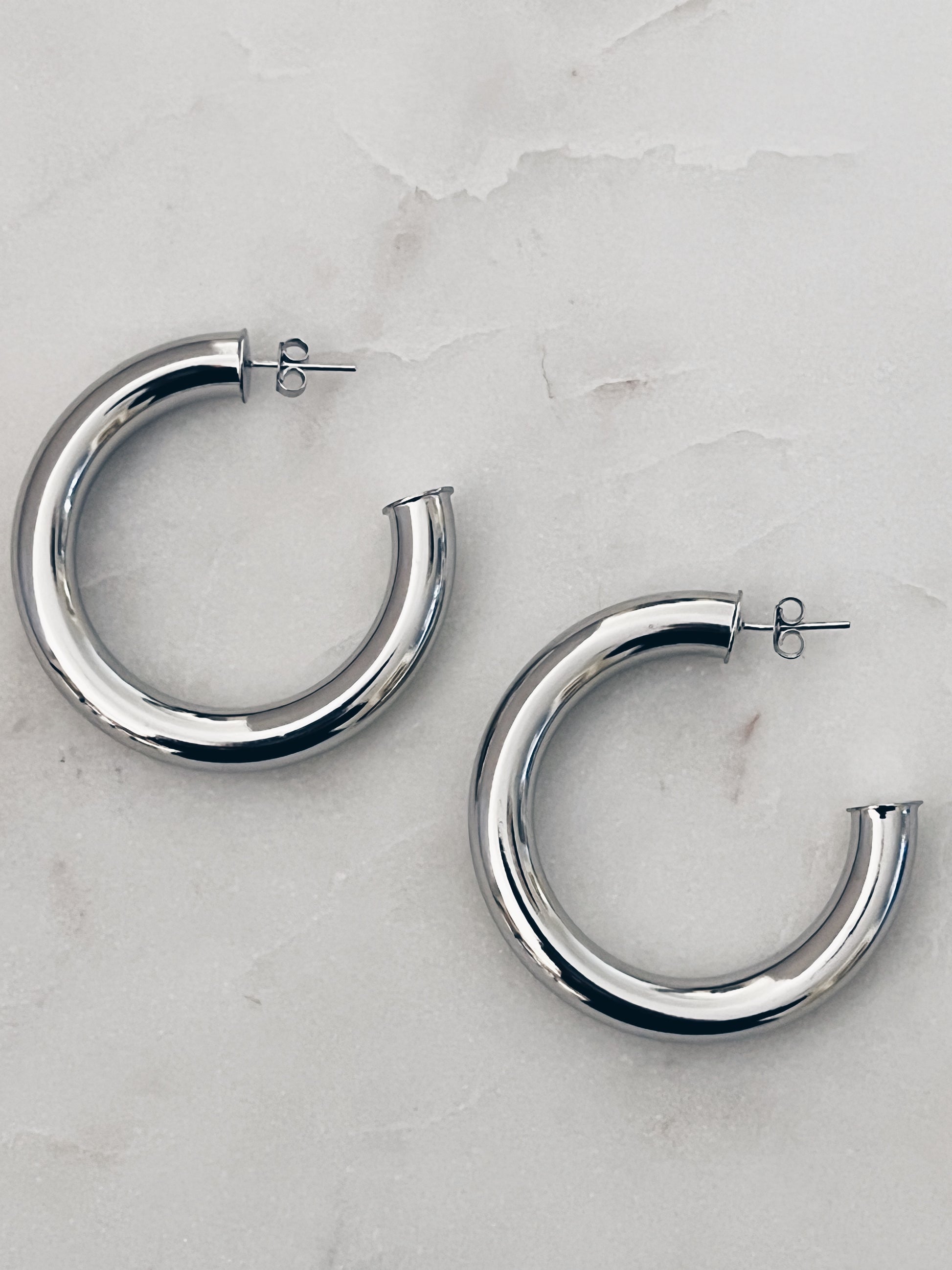 If you love these, you will love our Chunky Mini Rhodium Hoops! About 26 mm and 6mm thick.