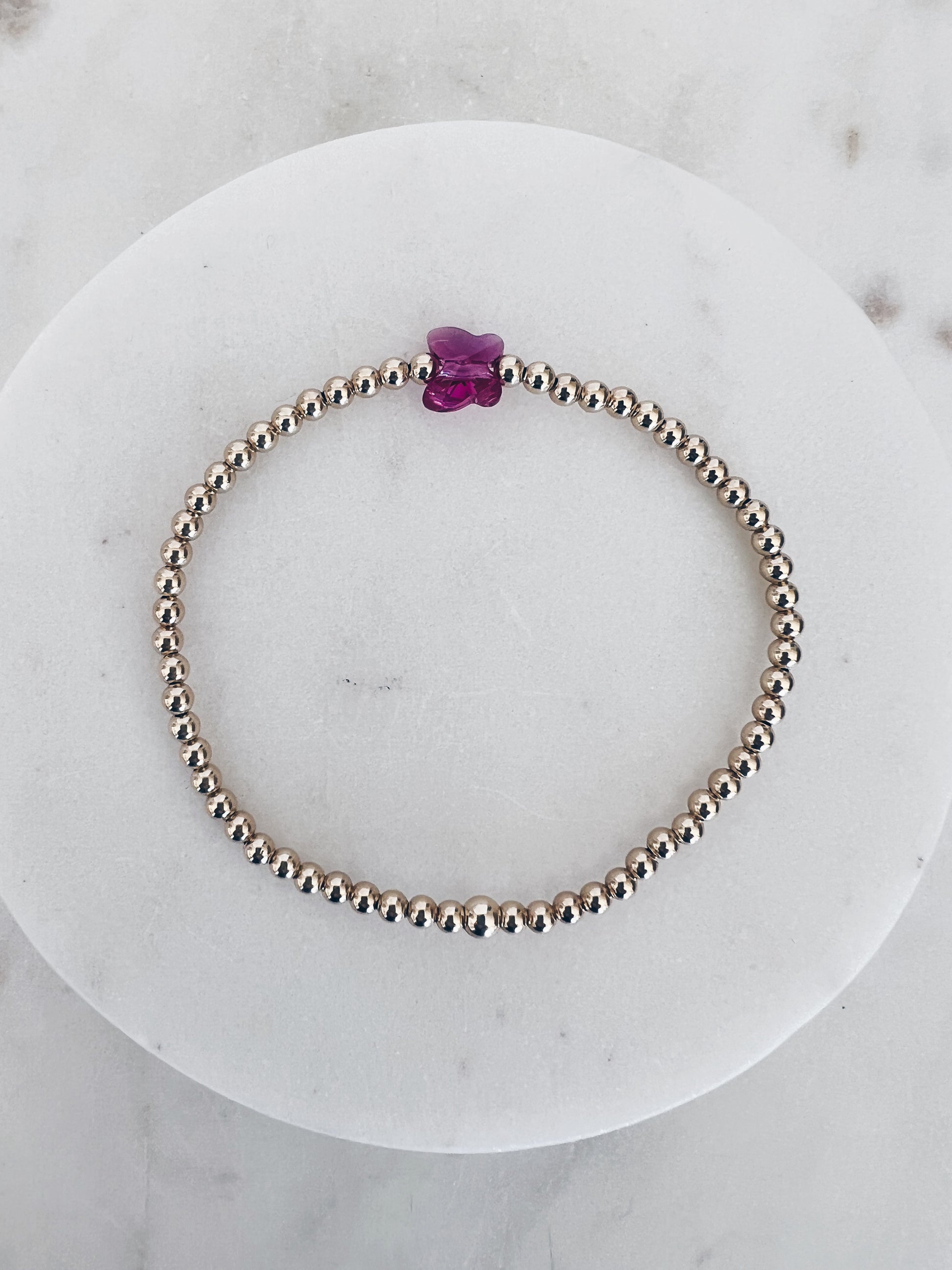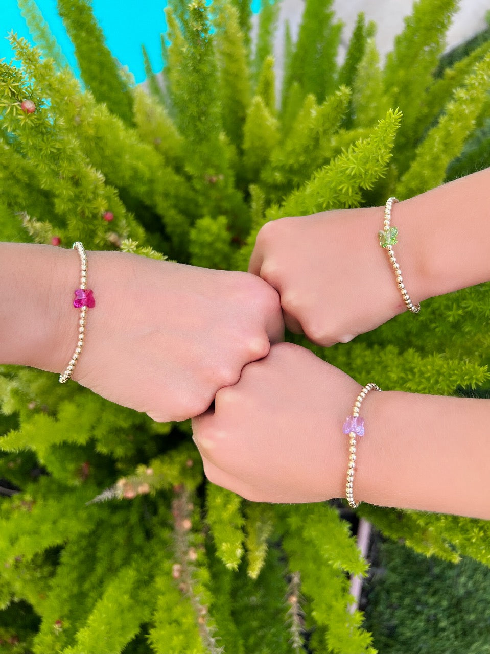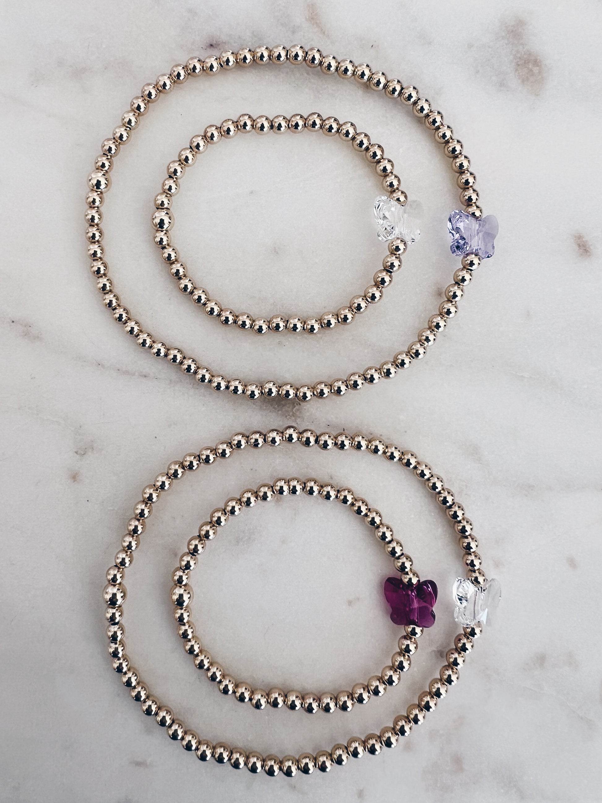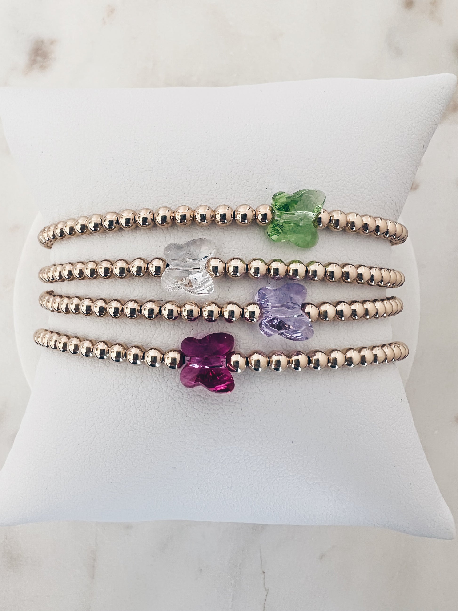 14k gold filled beads and a sparkly Swarovski crystal butterfly that are hand beaded to create this pretty bracelet. Perfect for Mama or someone special and their mini's.