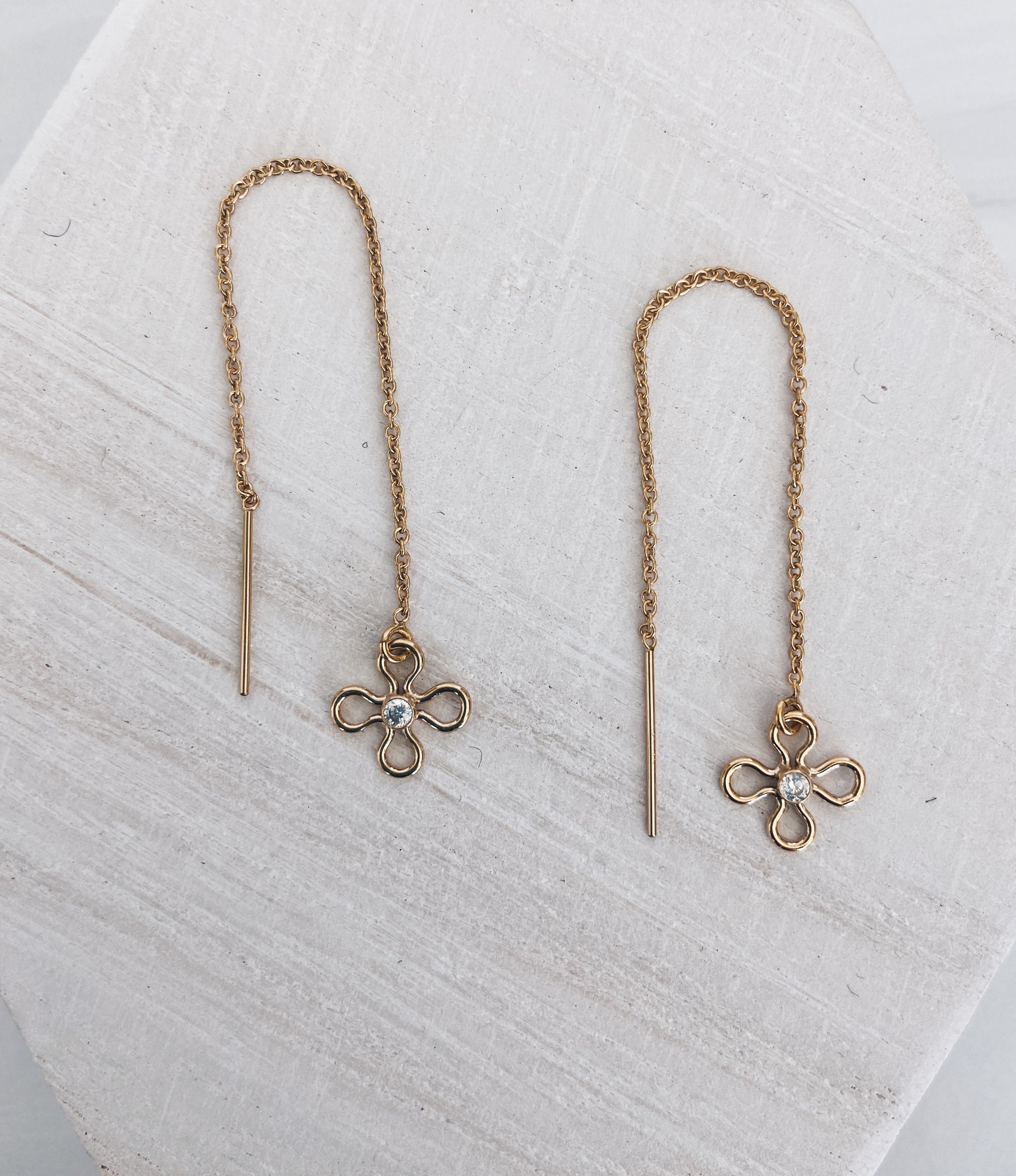 14k gold filled threader earrings adorned with pretty little gold filled cz daisy charms. Super light weight.