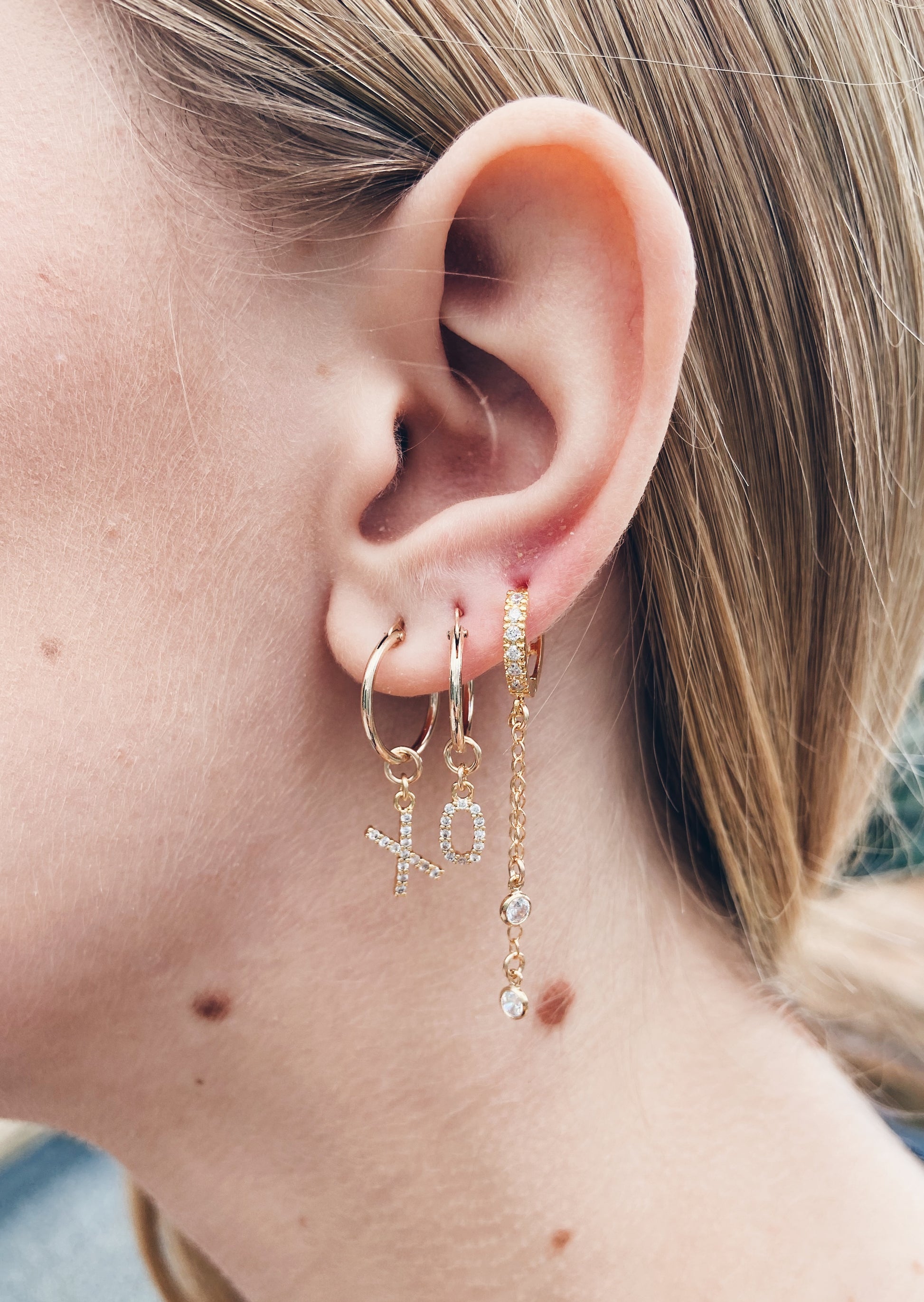 14k gold filled hoops adorned with gold plated cz XO charms.