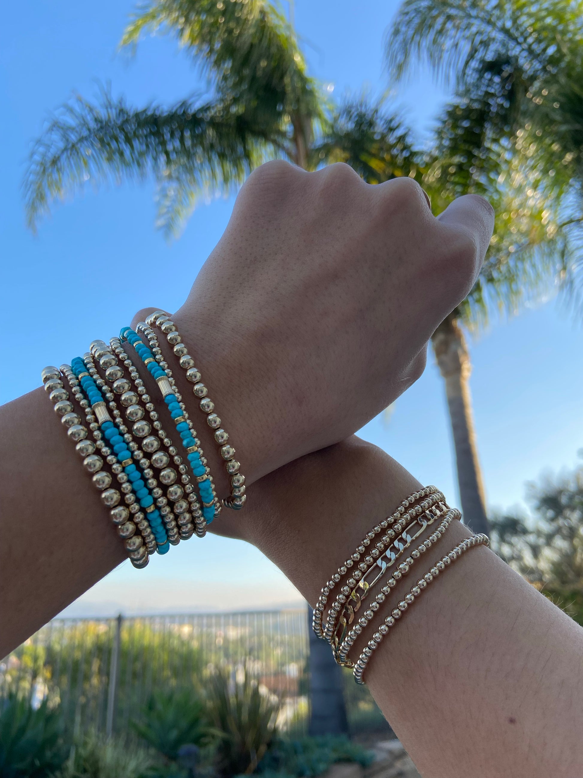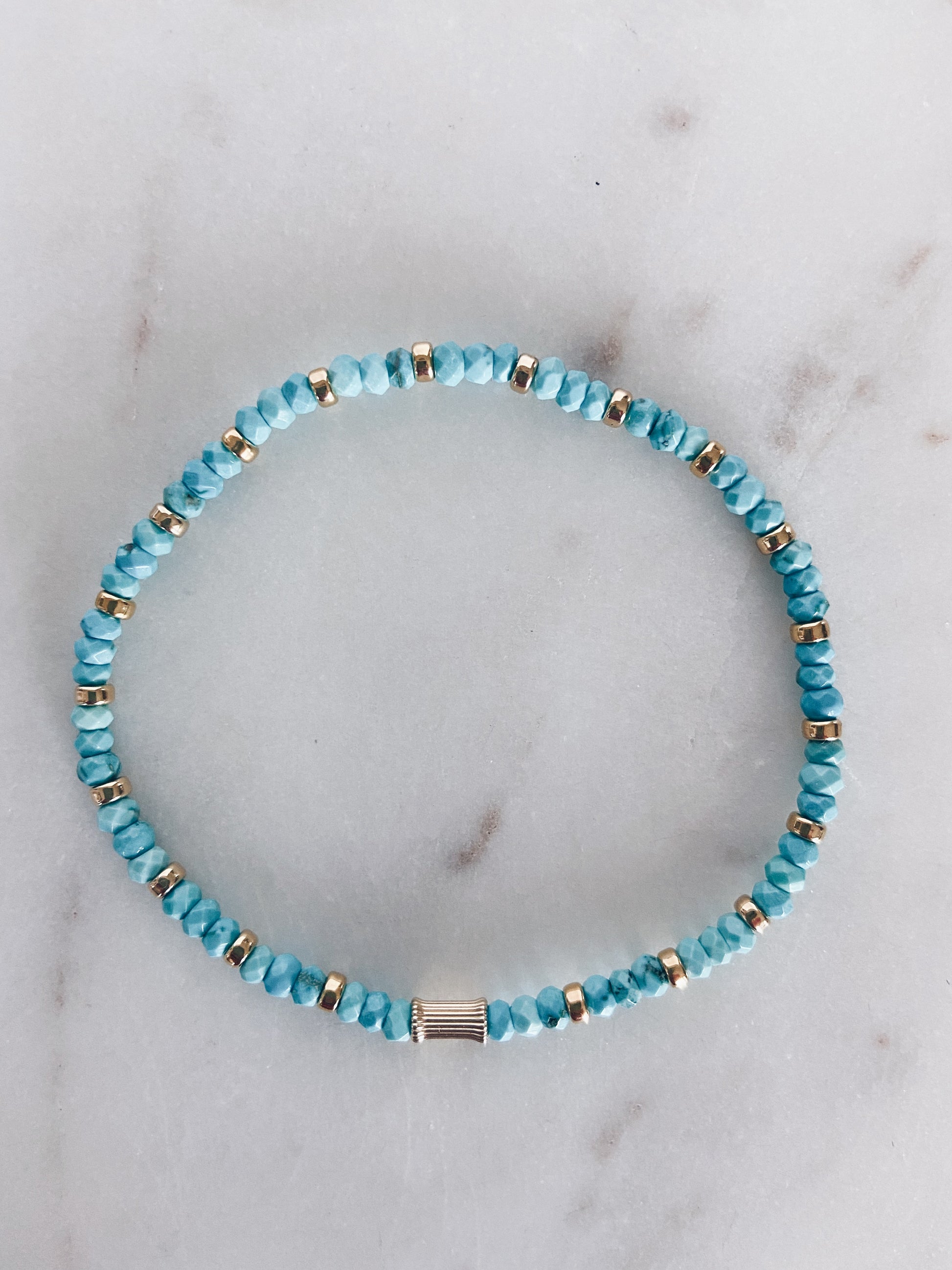 Tiny turquoise, 14k gold filled beads and a groovy barrel bead that are hand beaded to create a pretty bracelet.