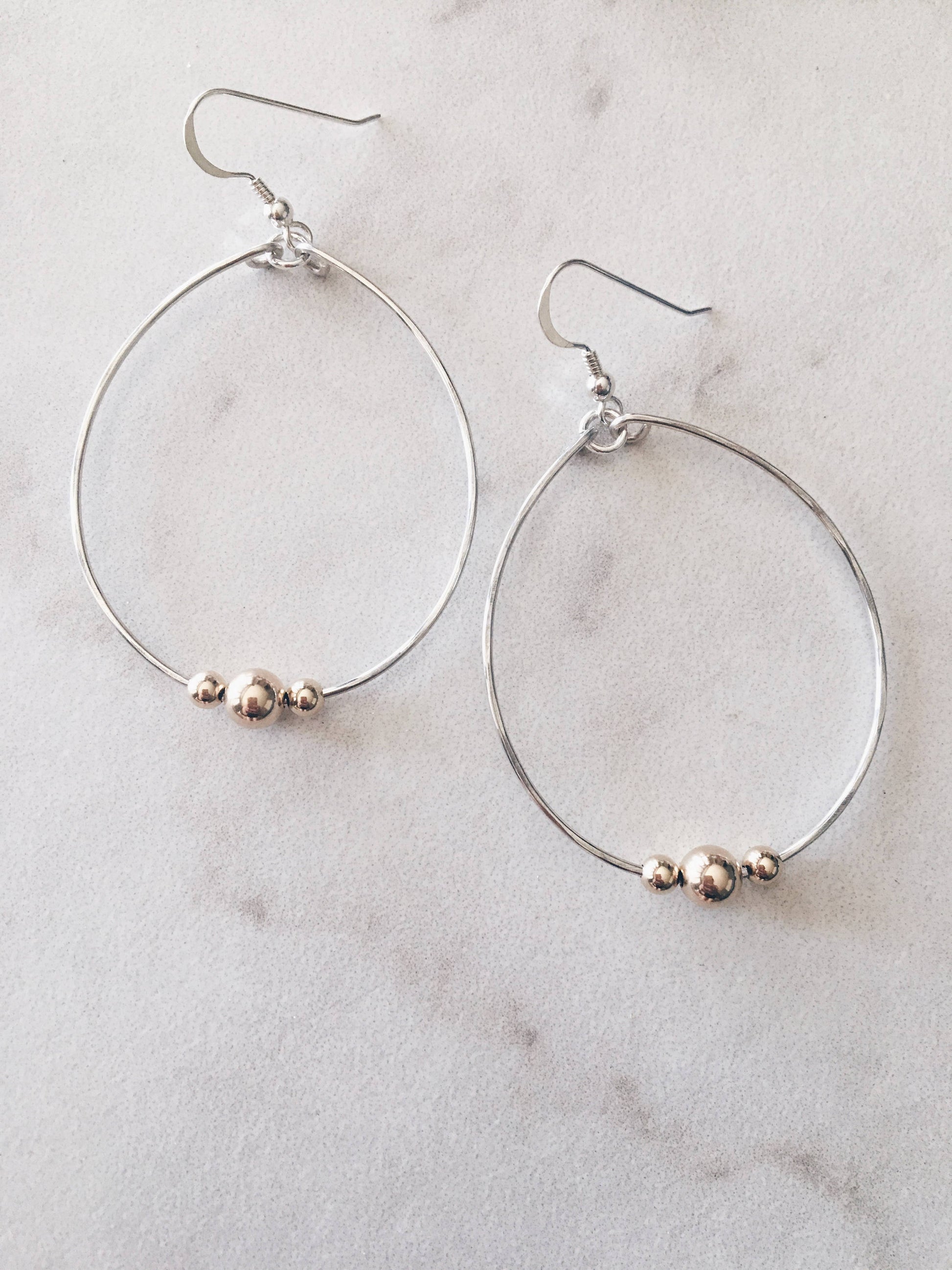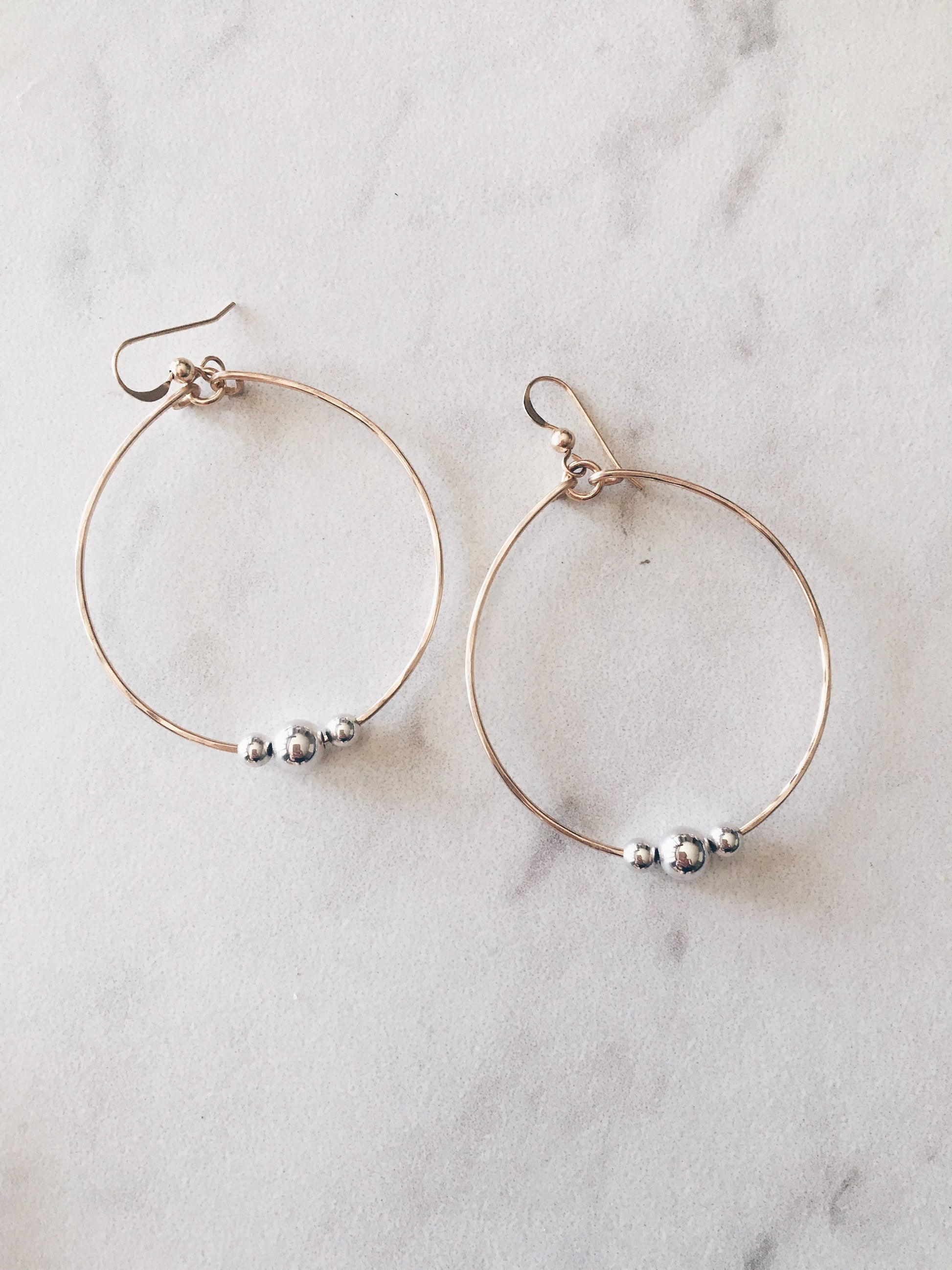 These pretty two tone hoop earrings are perfect dressed up or down! Hoops are handforged. Available in 14k Gold Fill w/Sterling Beads or Sterling w/Gold Fill Beads.