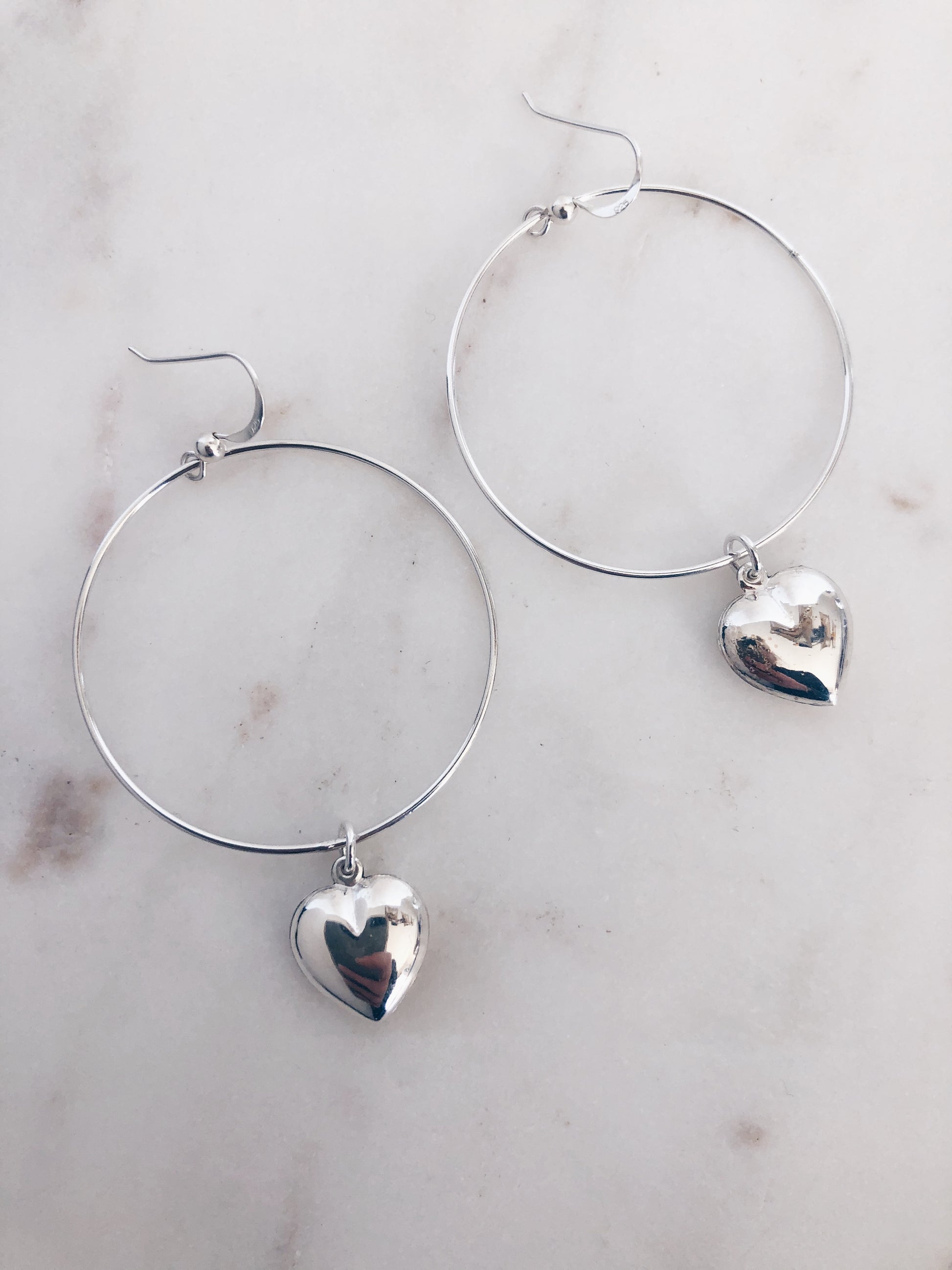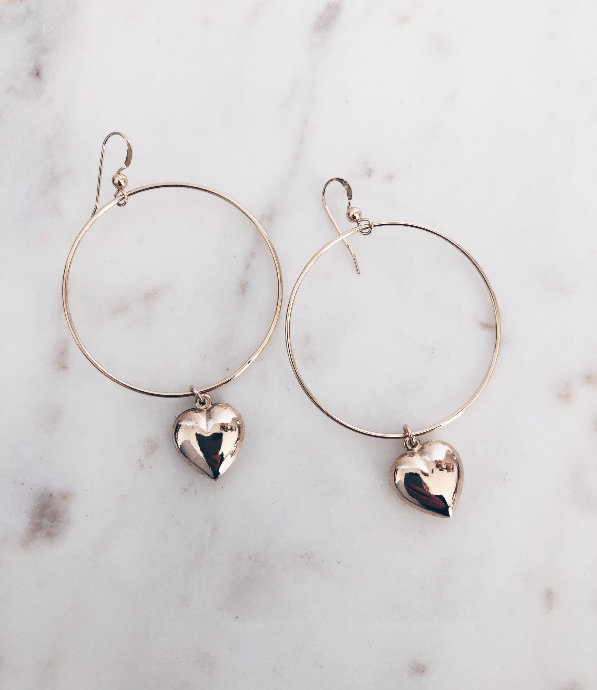 14k gold filled or sterling silver hoop earrings adorned with a pretty puffy heart.