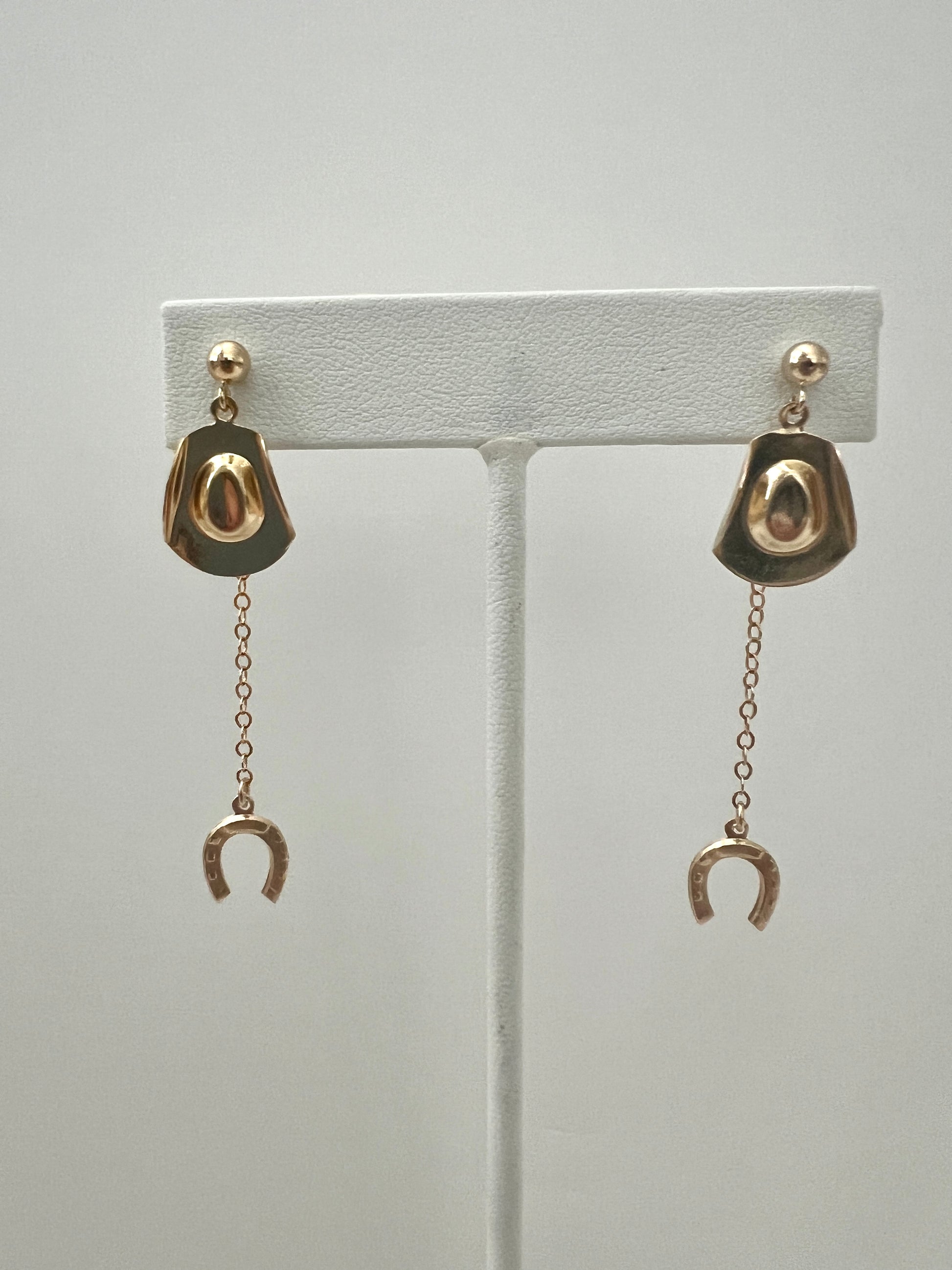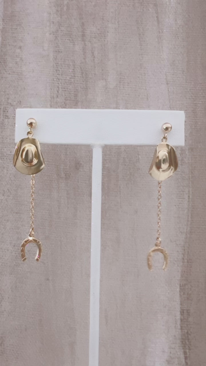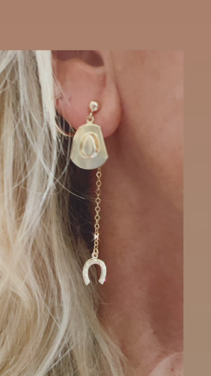 Lasso up with these fun cowboy hat and horseshoe drop/back earrings. All made with 14k gold fill. Super lightweight.