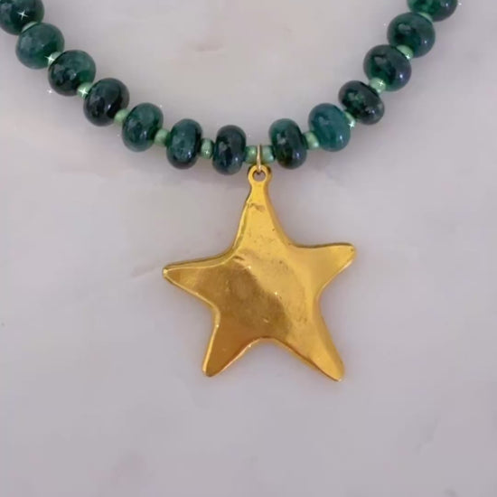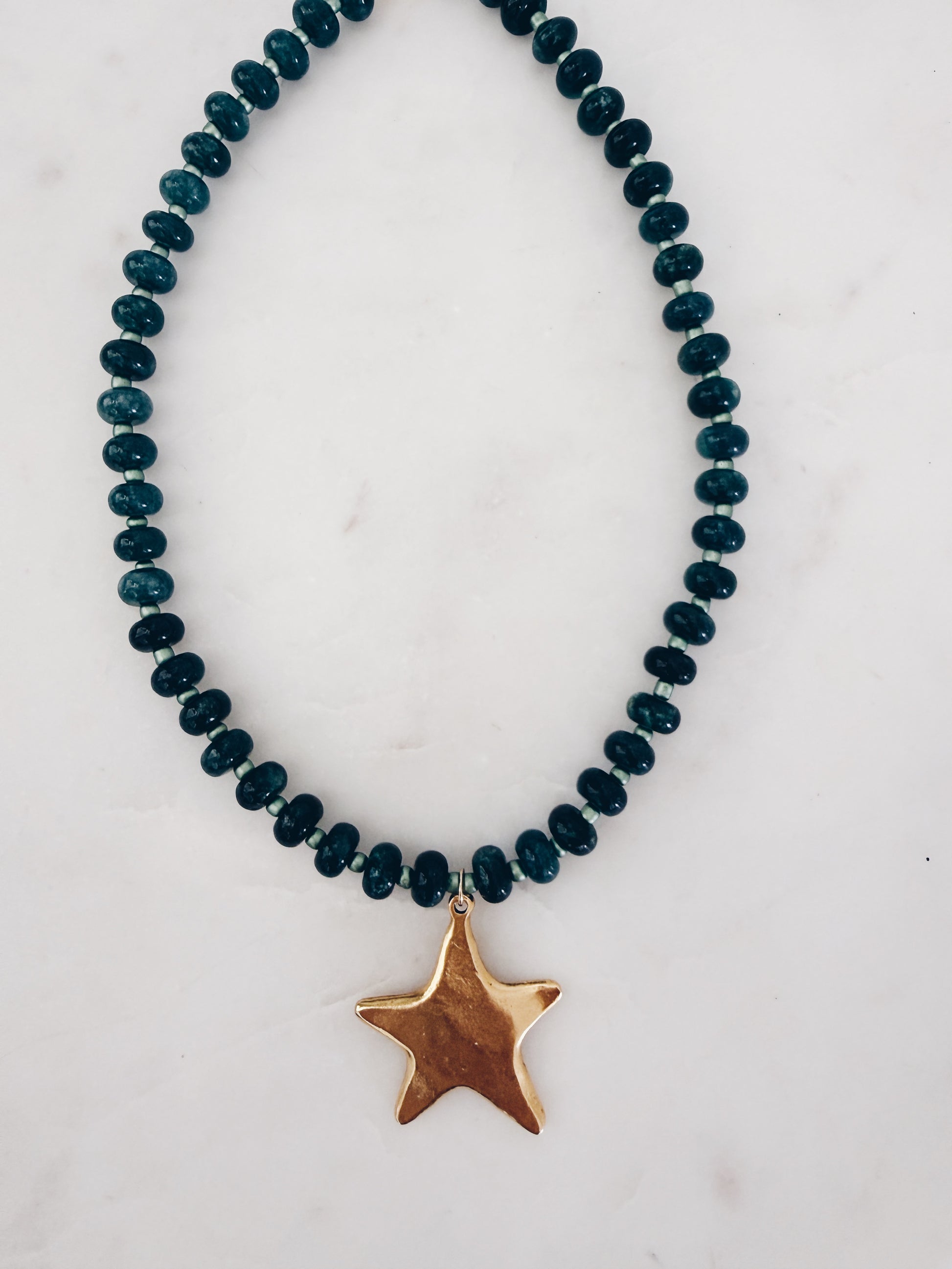 Soft, feminine, and effortlessly coastal, this hand-beaded gemstone necklace features luminous pretty teal gemstones adorned with a gold plated over brass star pendant for a look that feels both fresh and timeless.