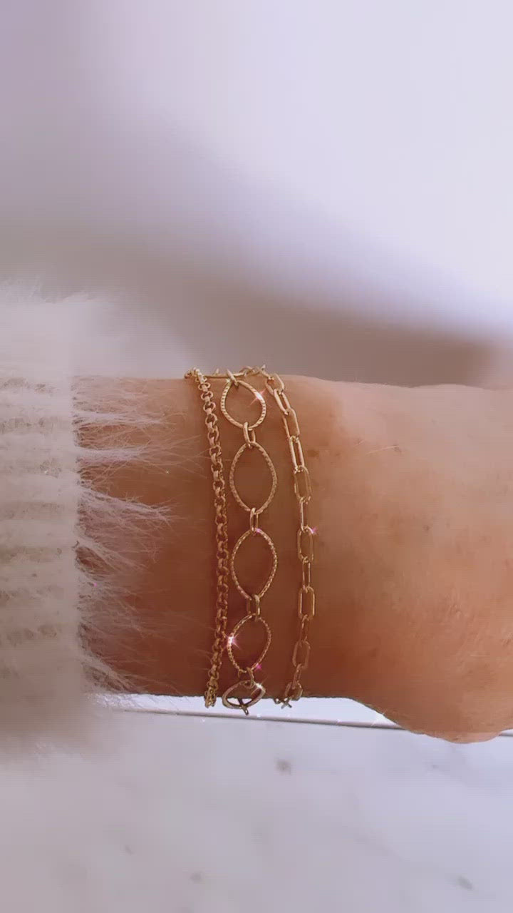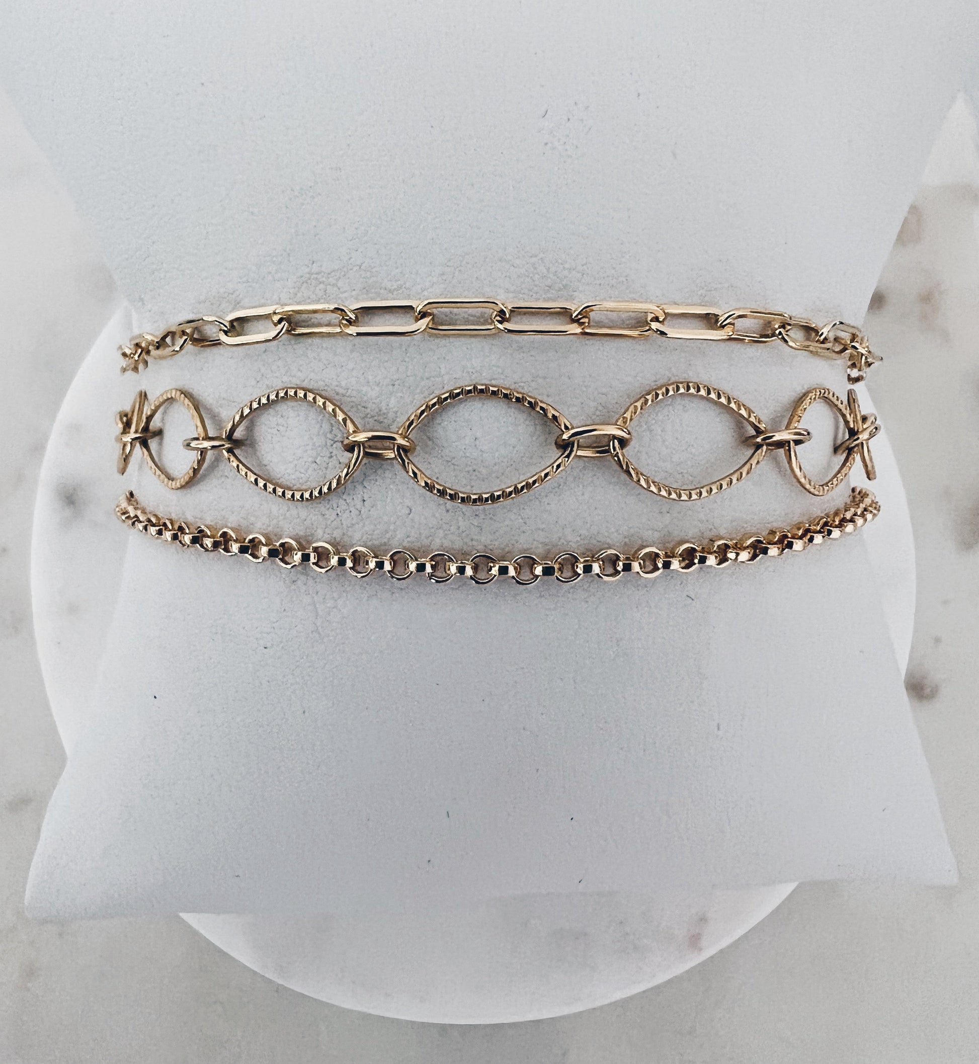 This stunning bracelet is handmade with all 14k gold filled mixed chains and components. Multiple strands make this bracelet an easy yet undeniably chic way to create the perfect stack.
