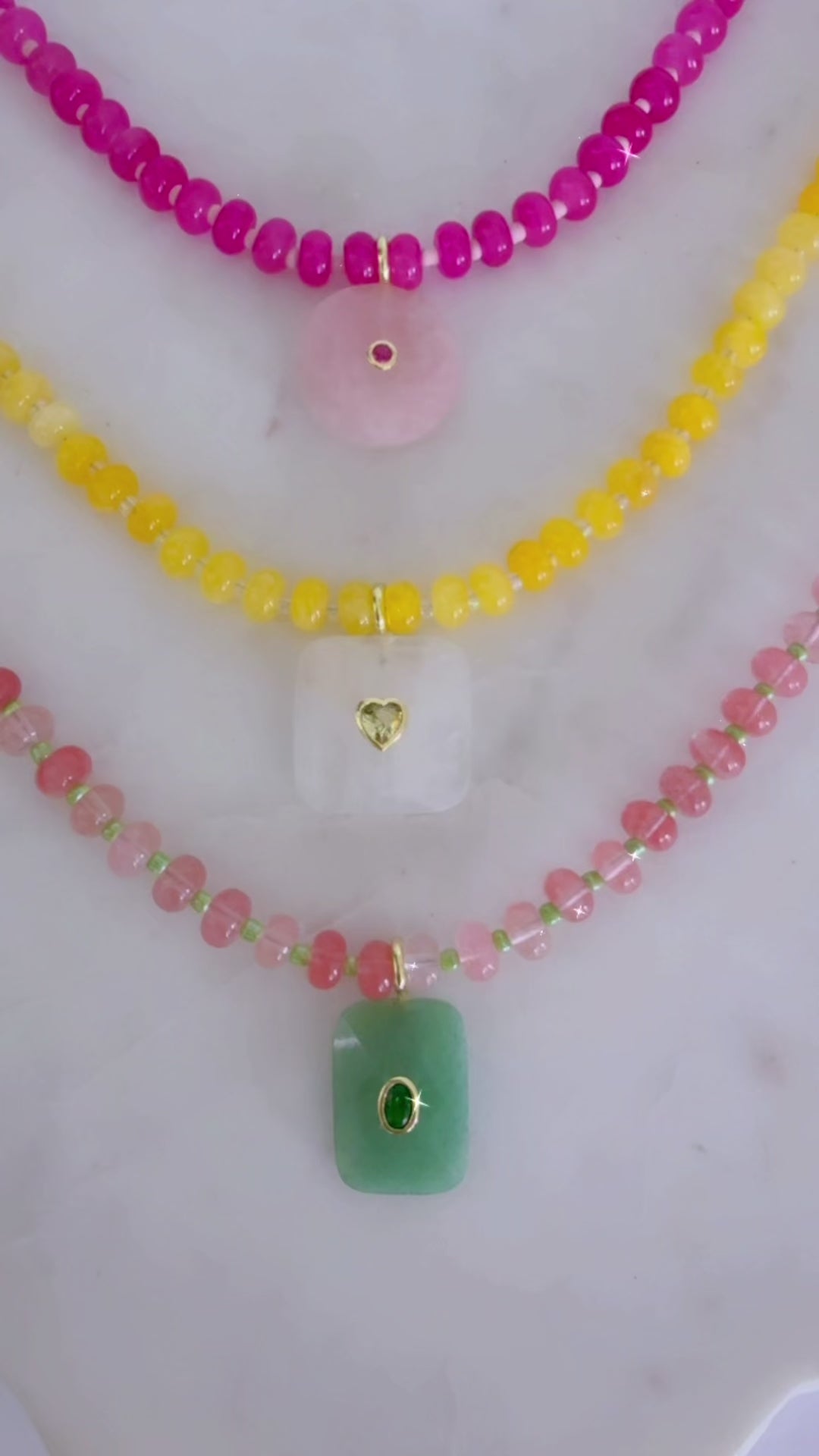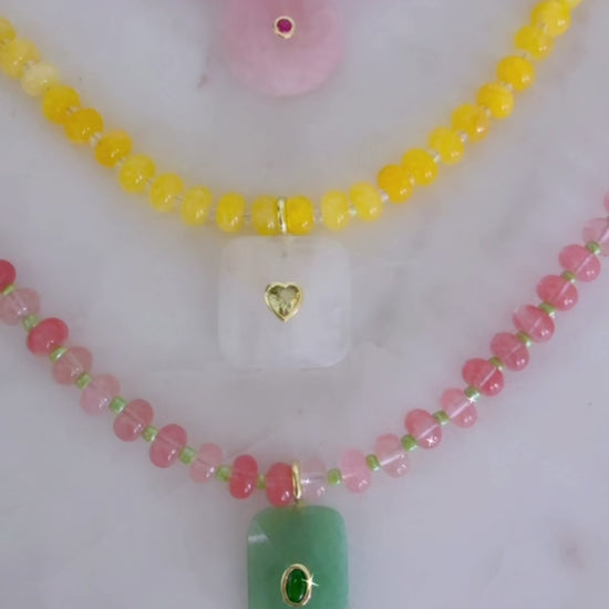 Soft, feminine, and effortlessly coastal, this hand-beaded gemstone necklace features luminous soft yellow gemstones paired with a smooth clear quartz pendant for a look that feels both fresh and timeless.