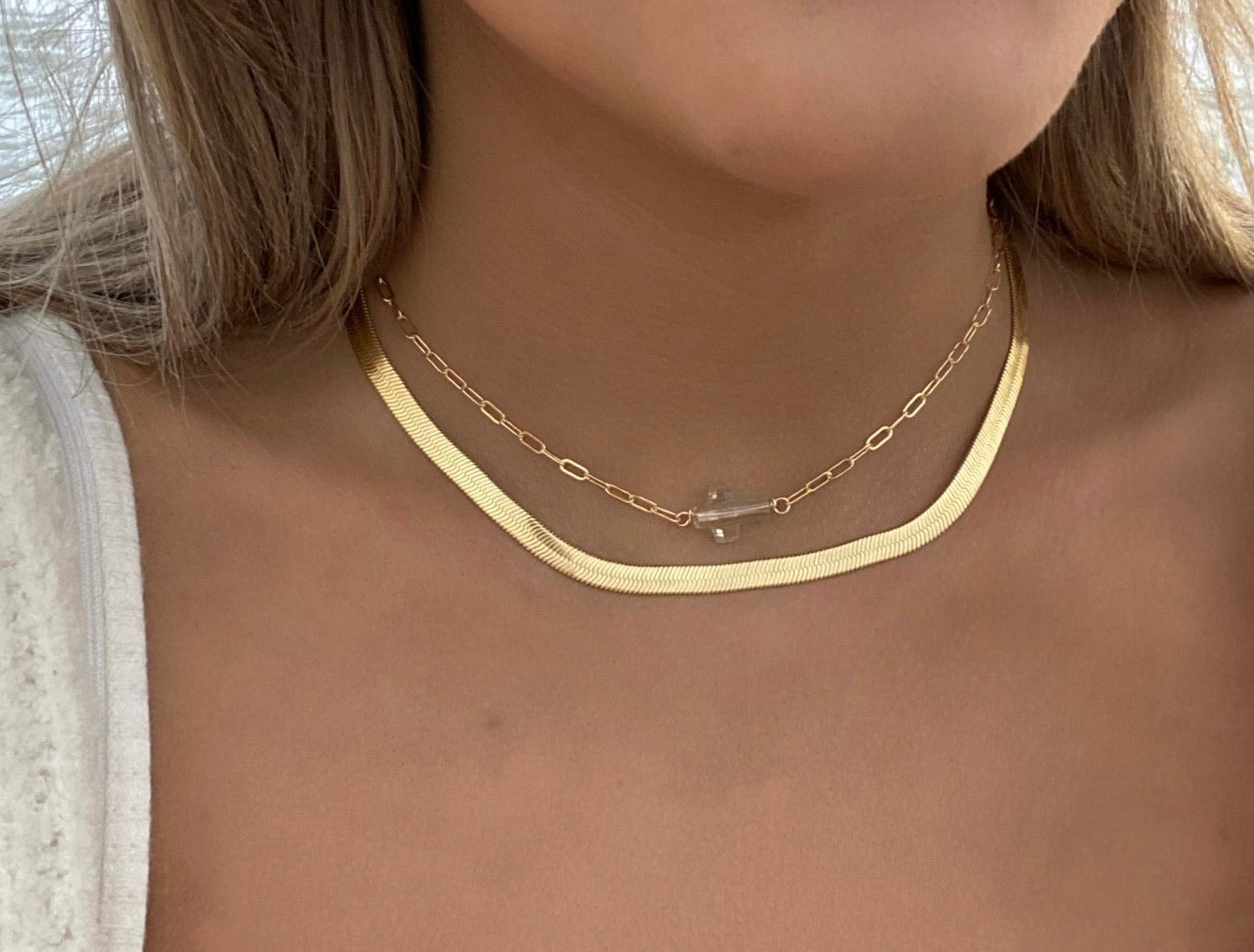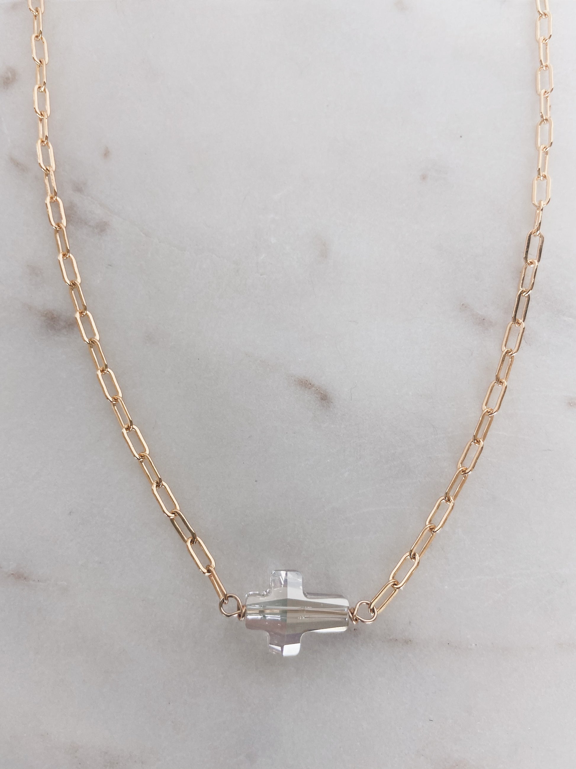 14k gold filled short link chain is adorned with a hand wired Swarovski crystal cross. Simply beautiful on its own or layered with your favs.