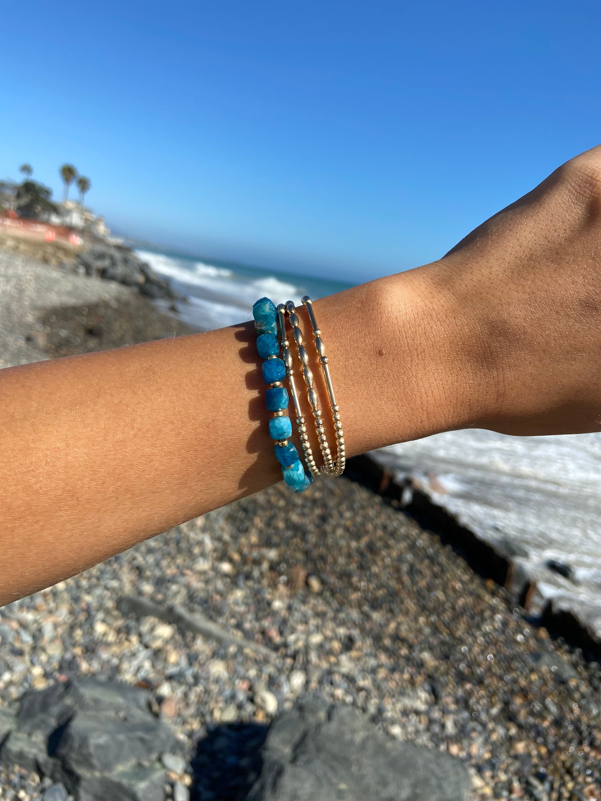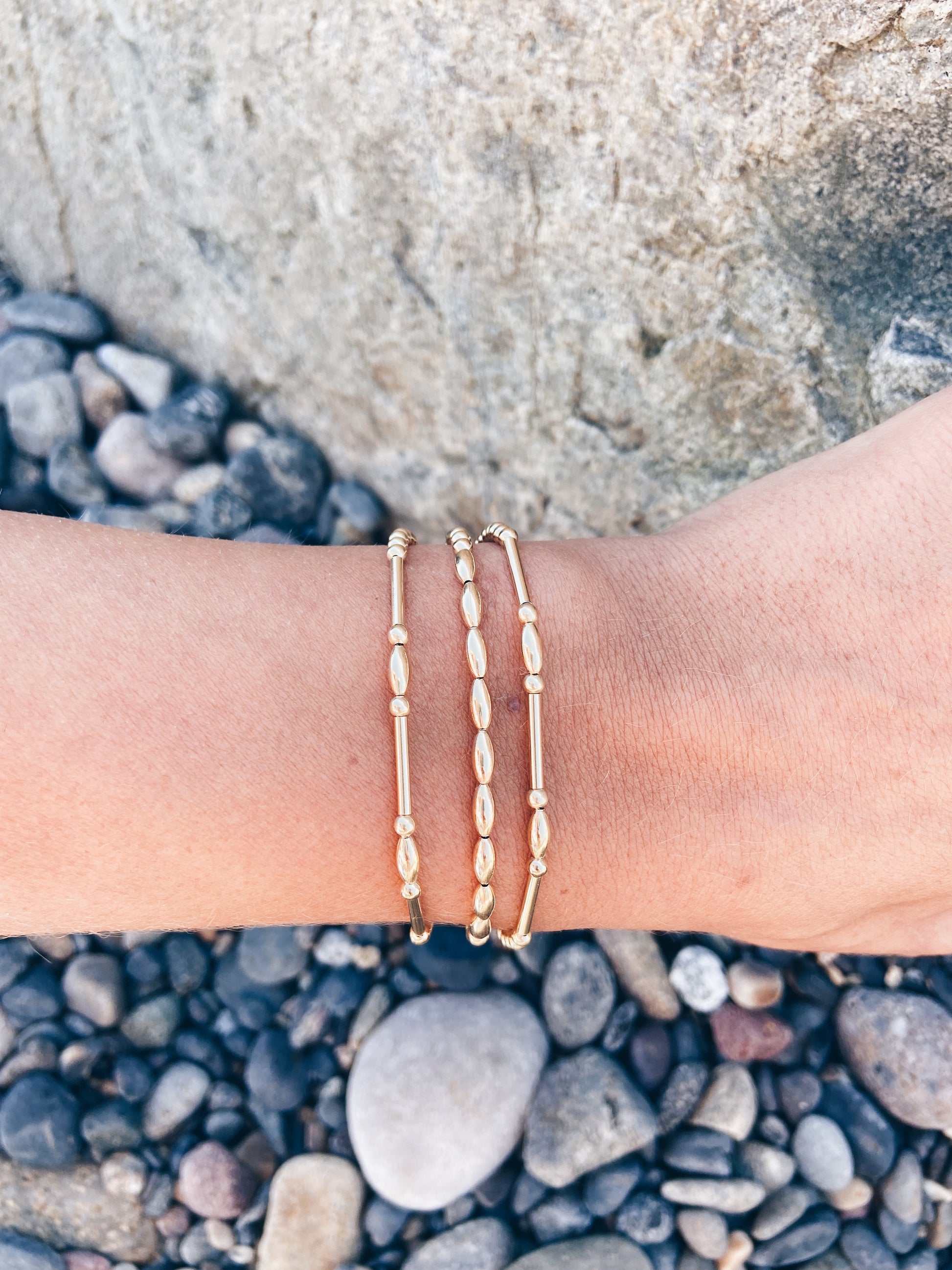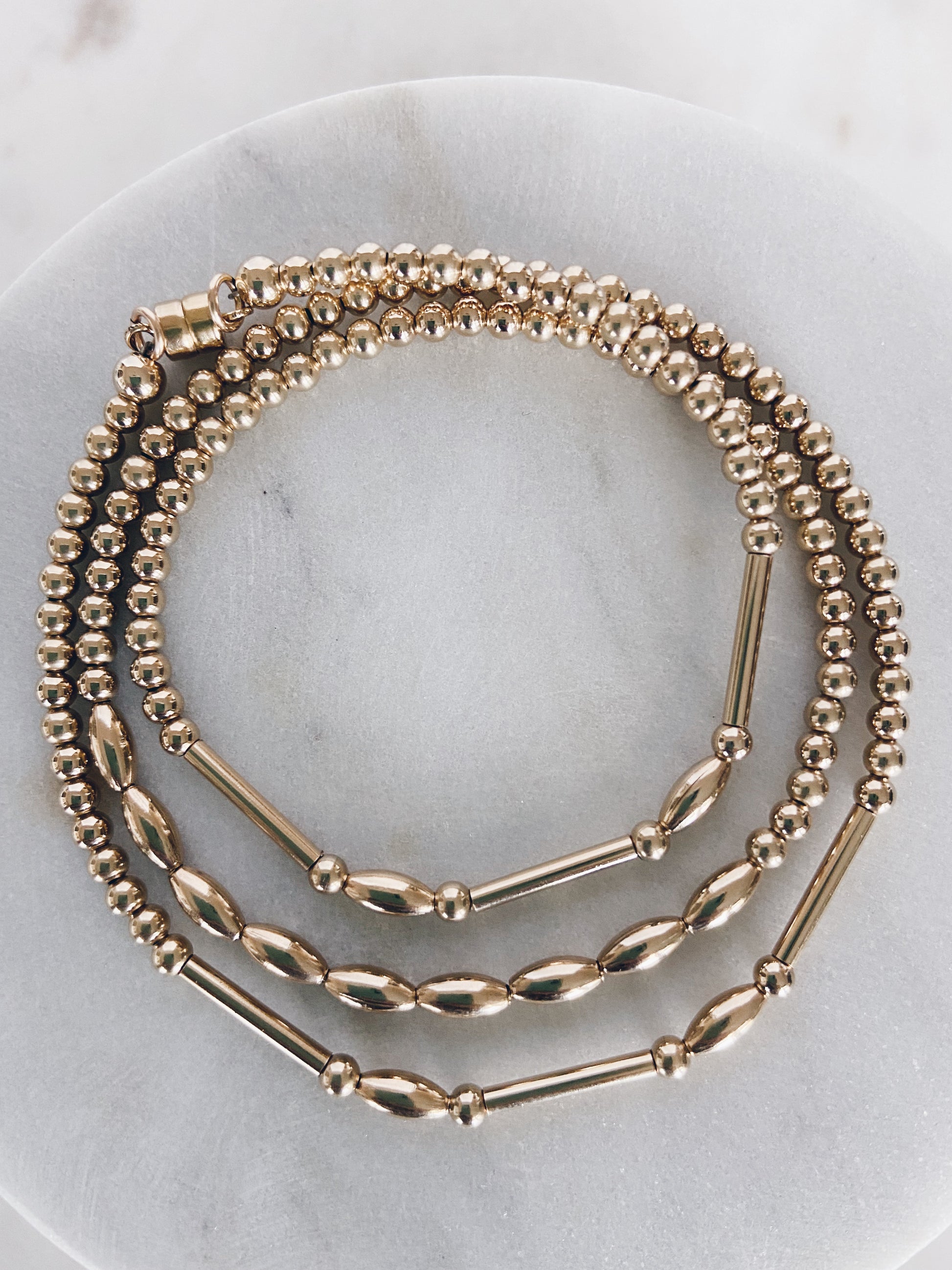 This beautiful bracelet is handmade with 14k gold filled round and barrel beads. Wraps three times around an average wrist size of 6.5 and can be worn as necklace.