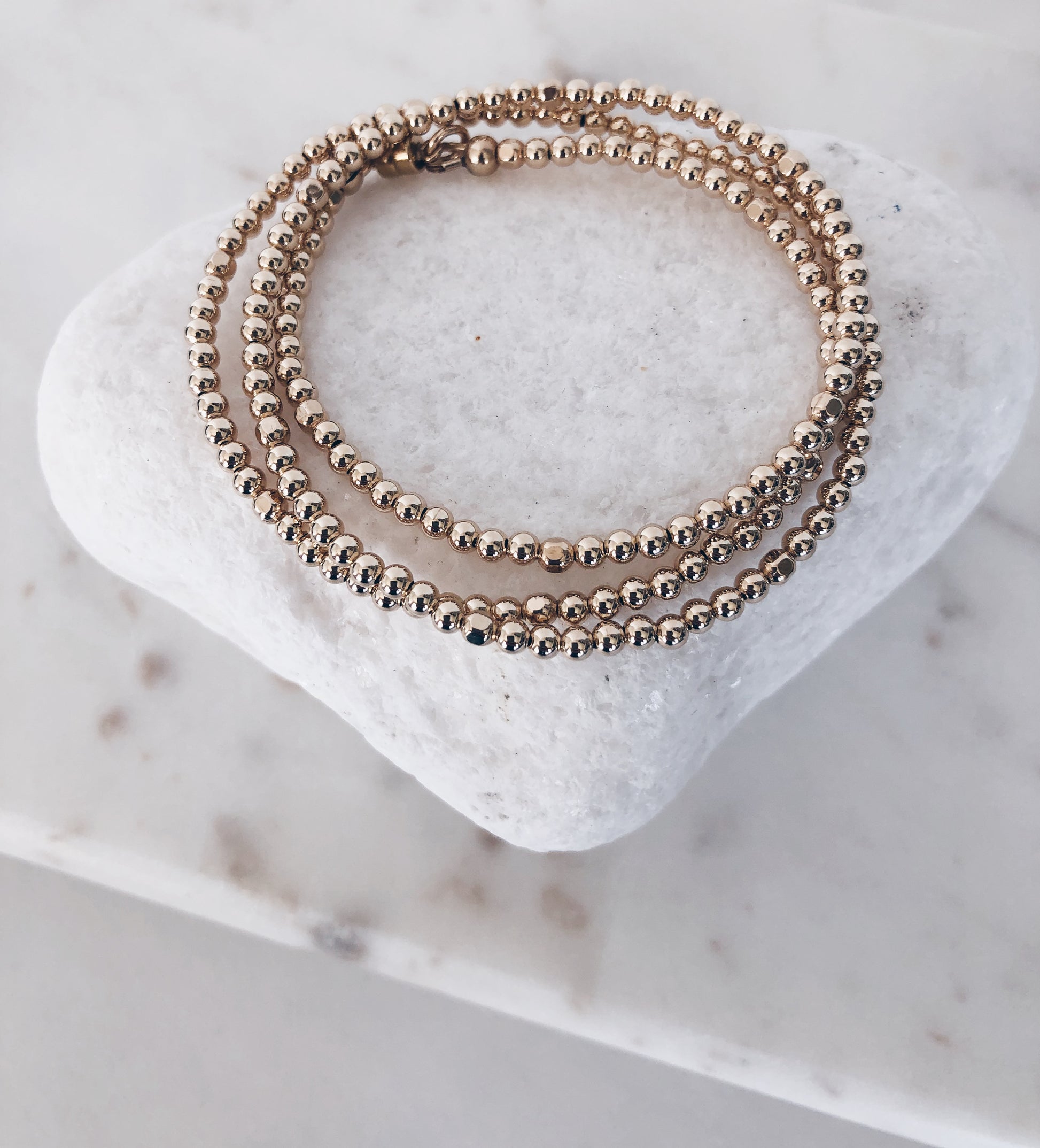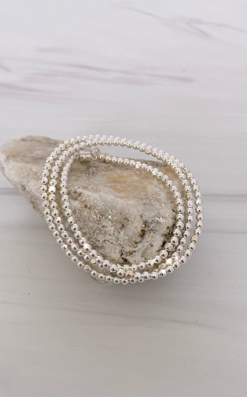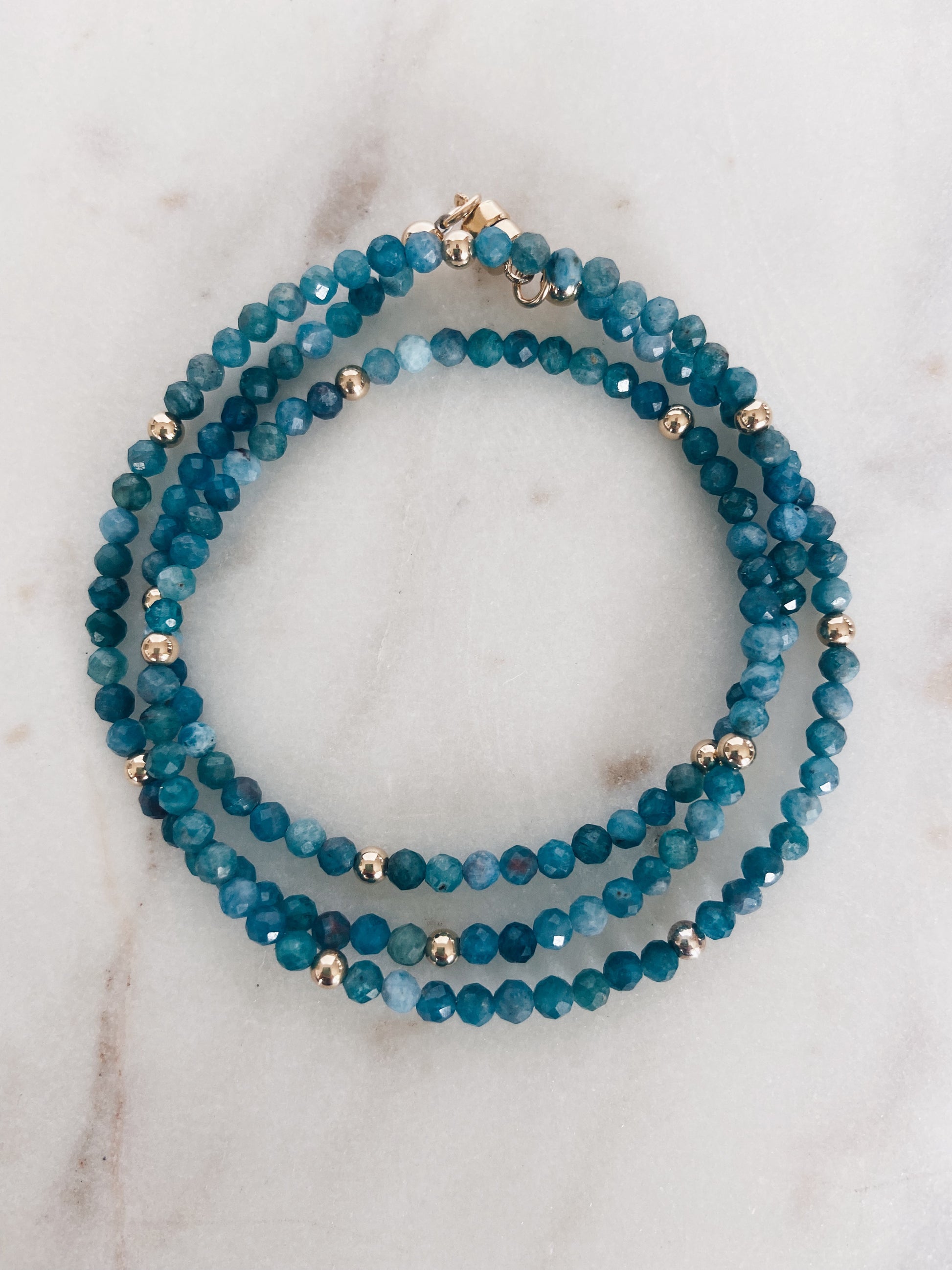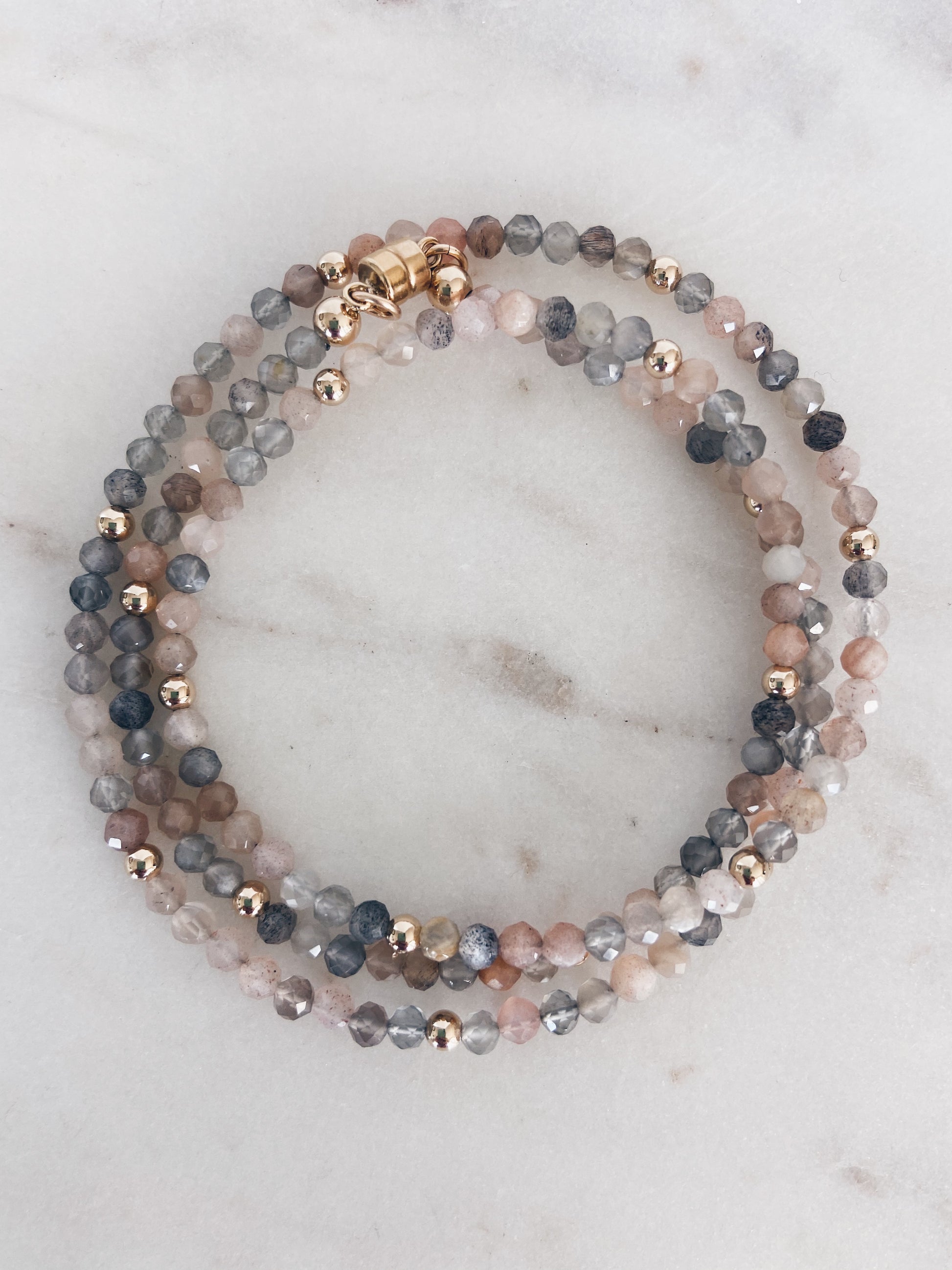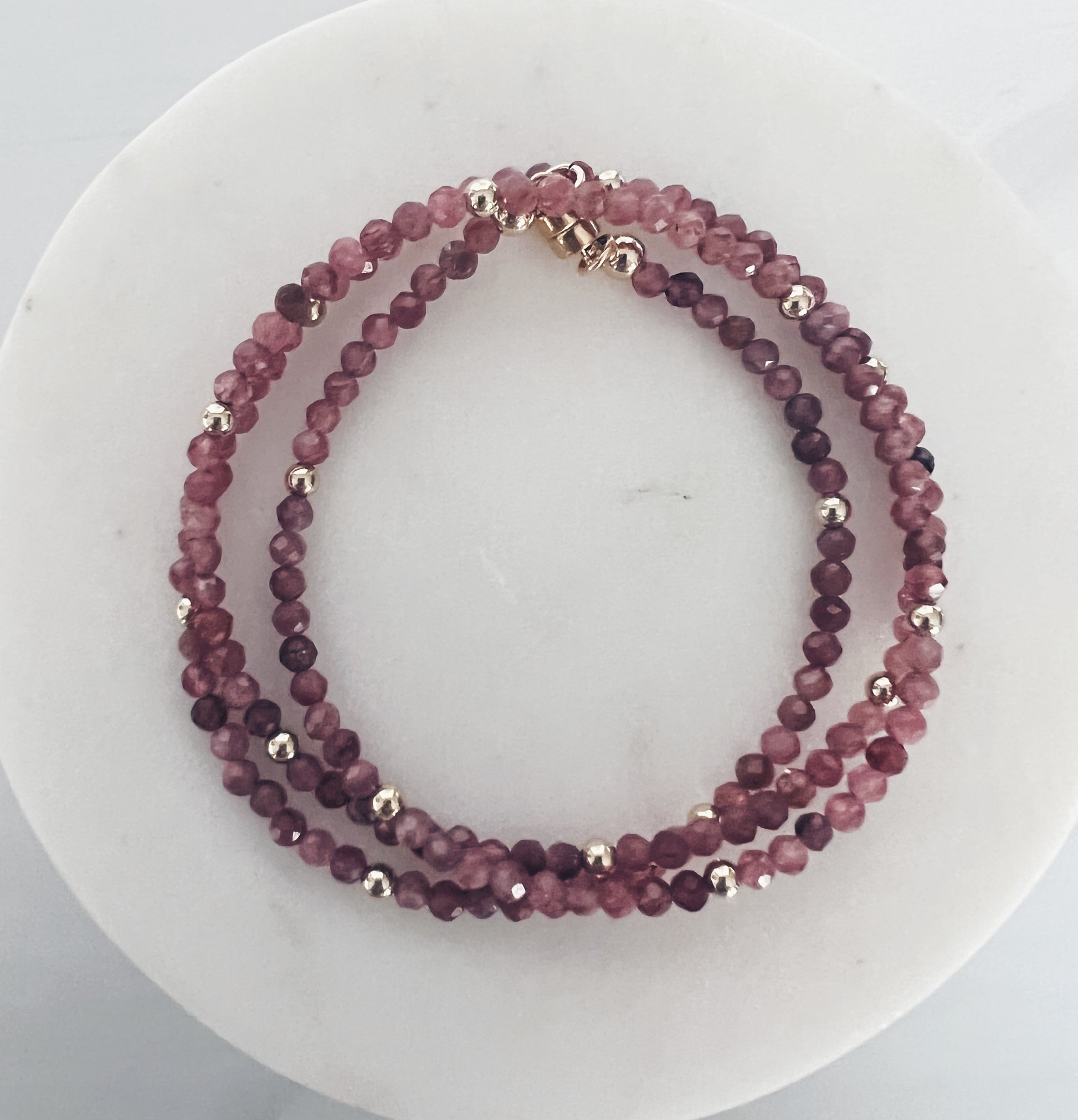 This best selling beautiful bracelet is handmade 14k gold filled, sterling silver and semi precious gemstones. Wraps around an average wrist size of 6.5 wrist three times and can be worn as a necklace.