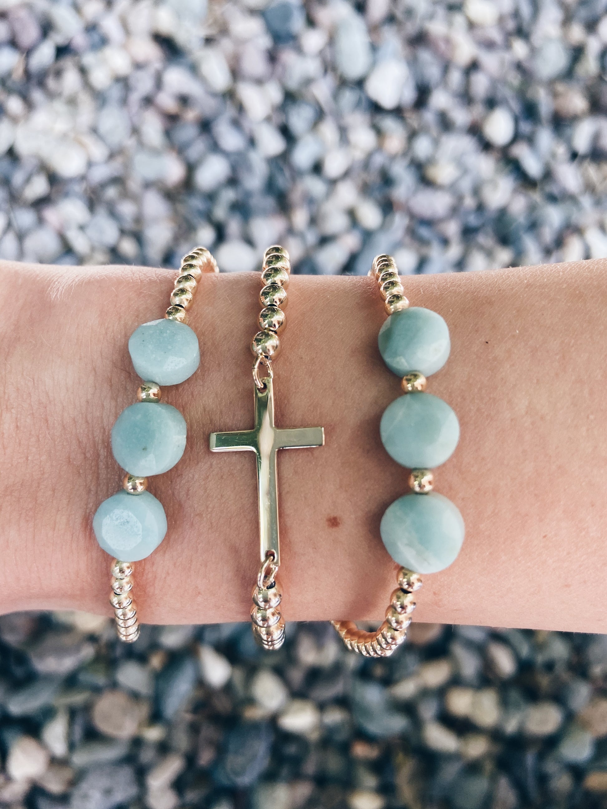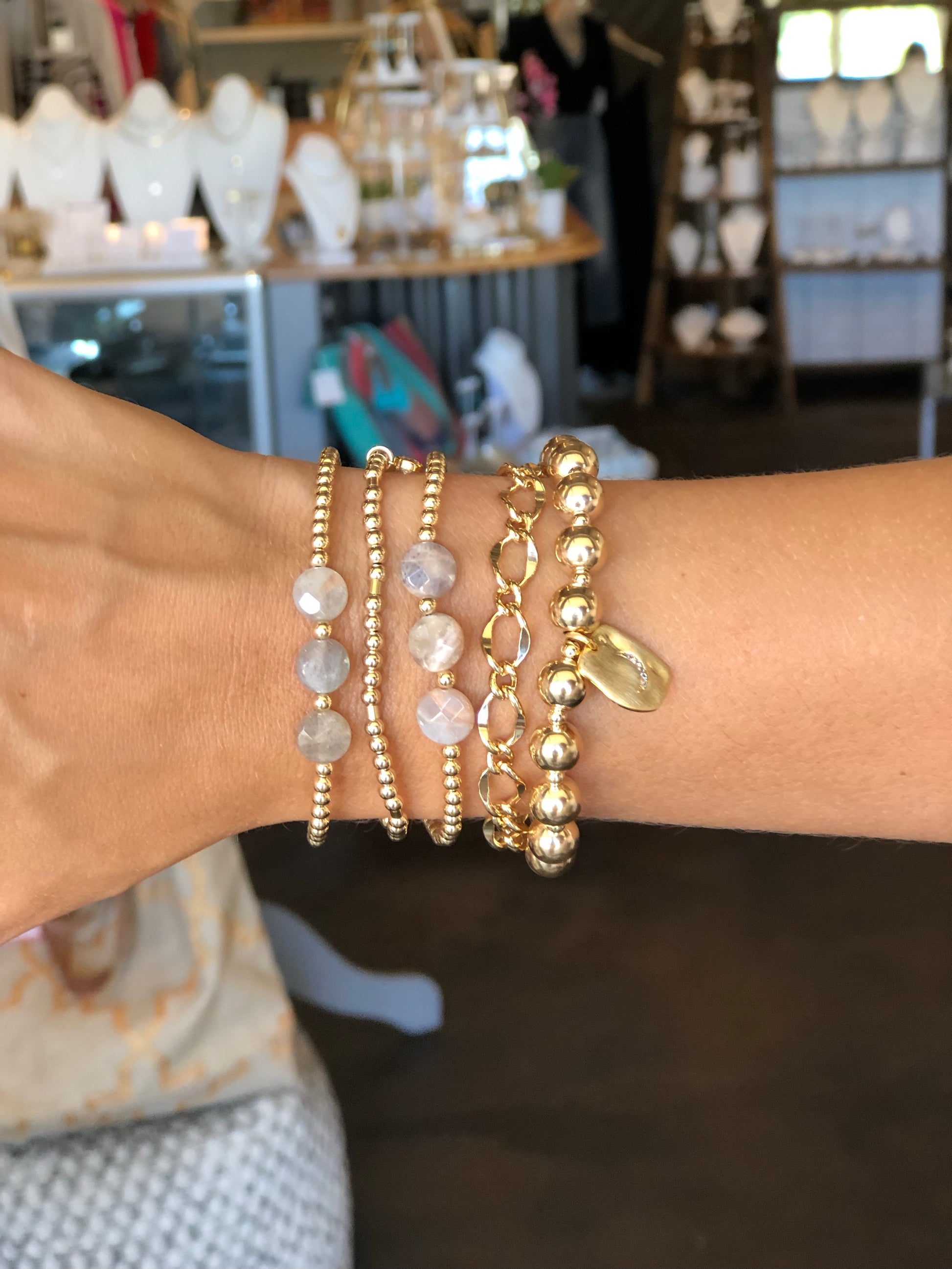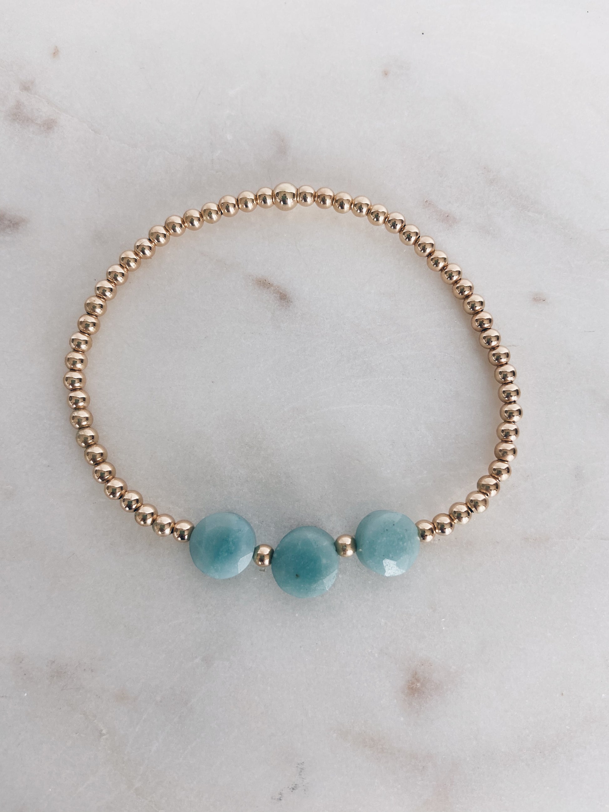 14k gold filled beads featuring three coin amazonite, labradorite or moonstones. Perfectly pretty worn alone or layered with your favs!