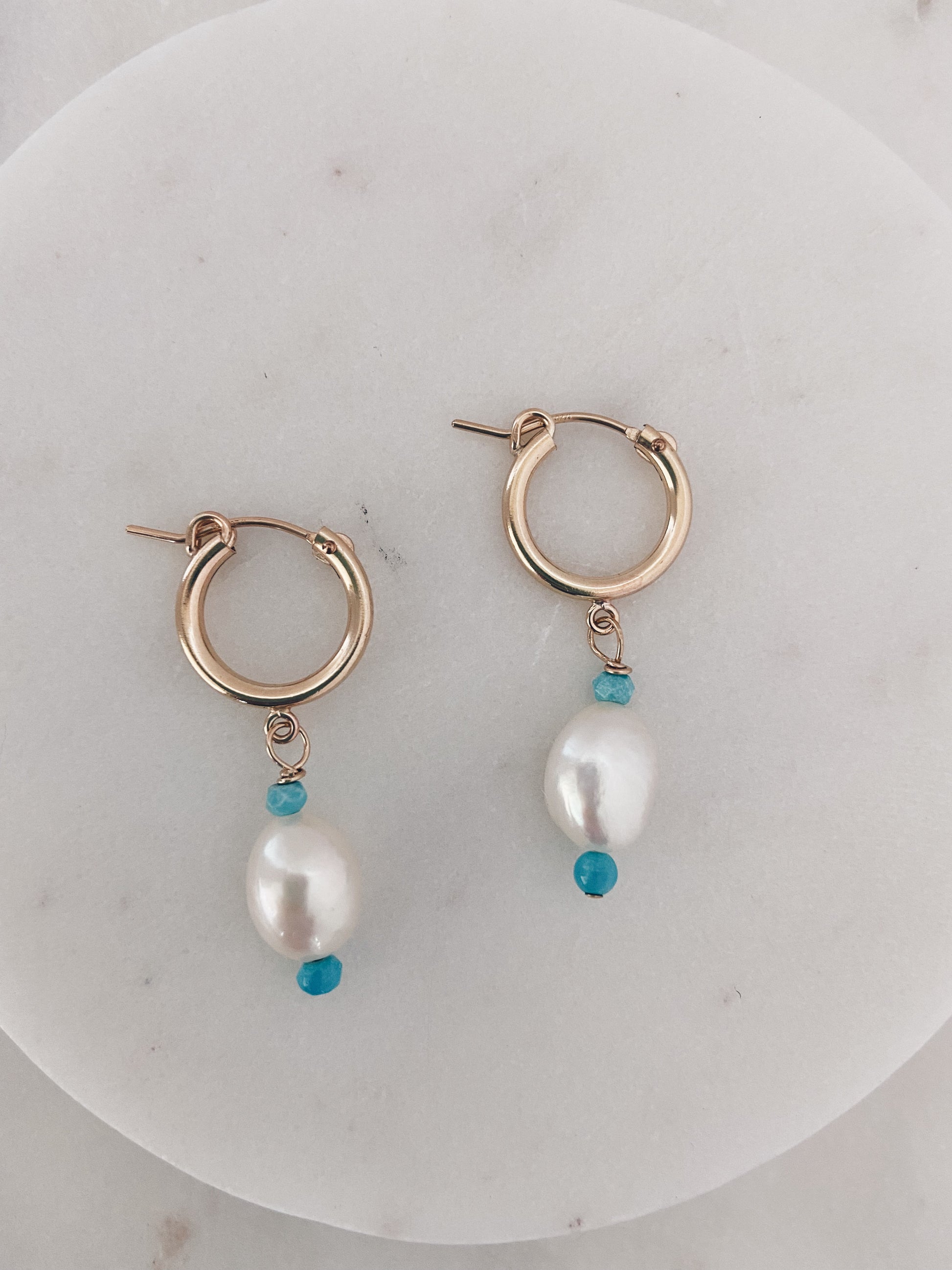 14k gold filled hoops adorned with baroque pearls and tiny turquoise beads.